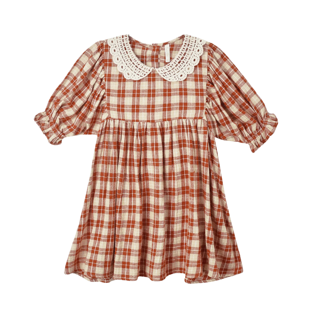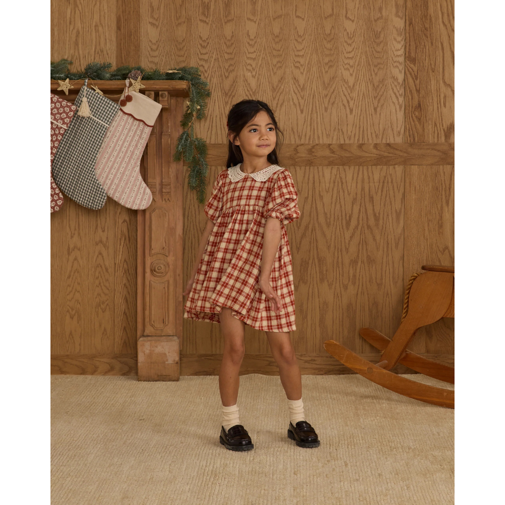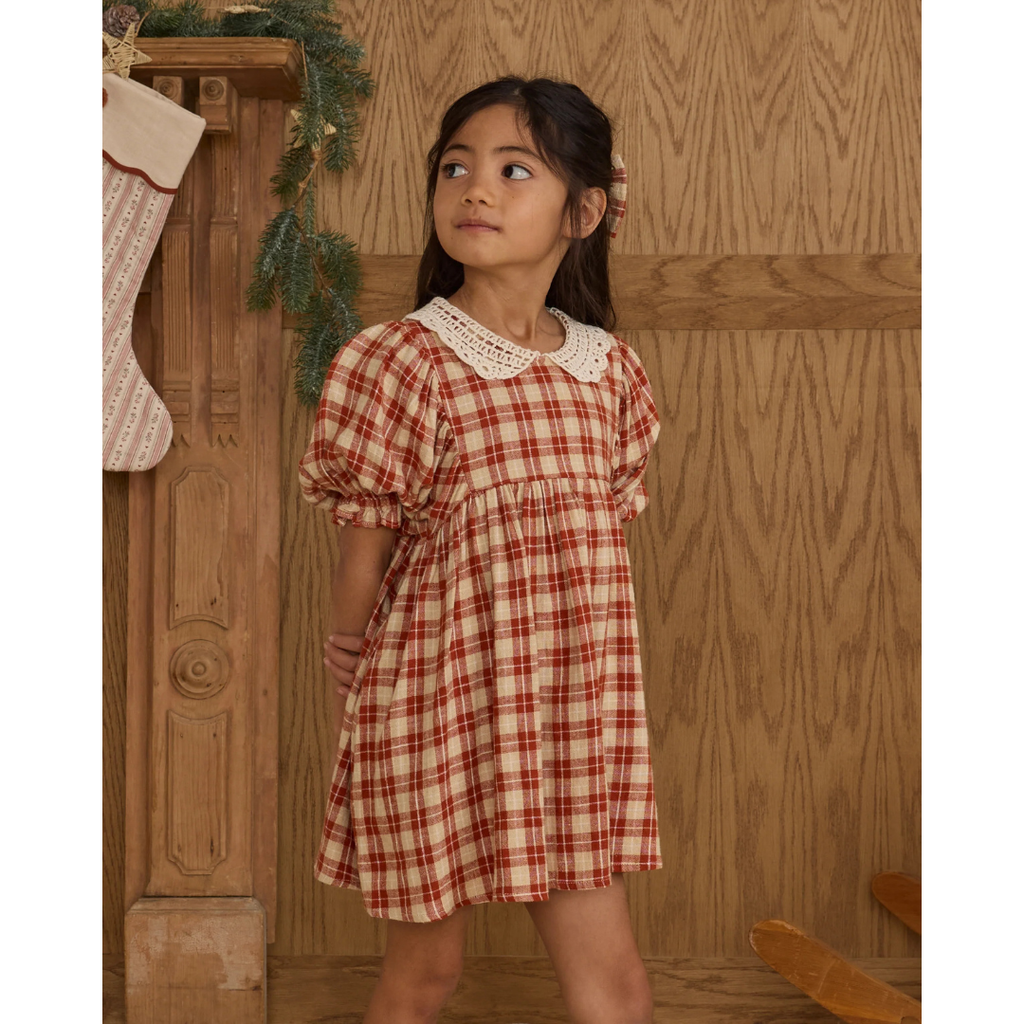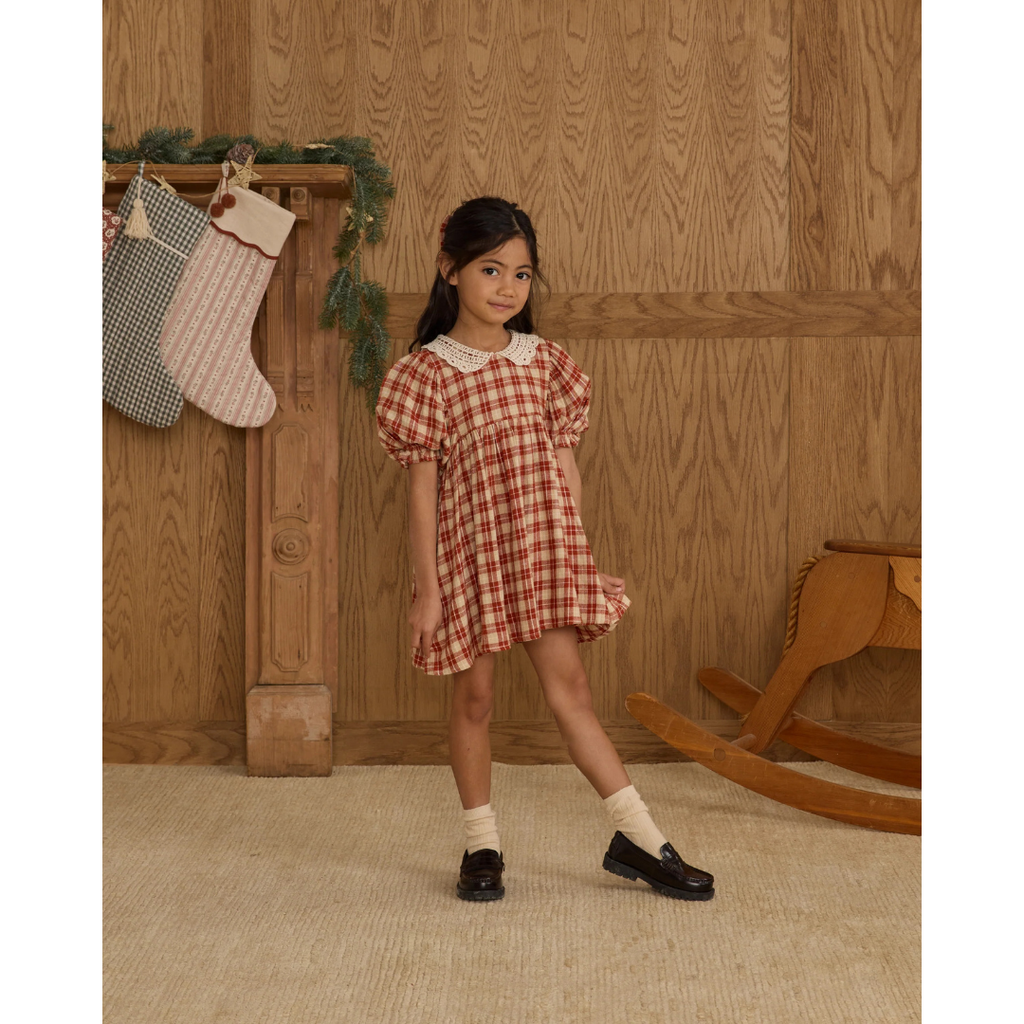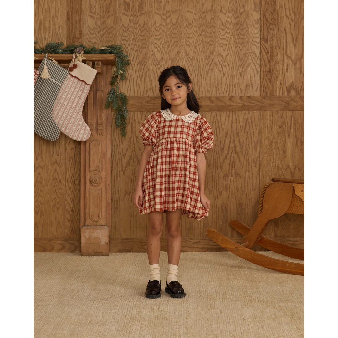 The Heidi Dress features an empire waist dress with balloon sleeve and a delicate collar along the neck. Featuring a 'red plaid' all-over pattern.