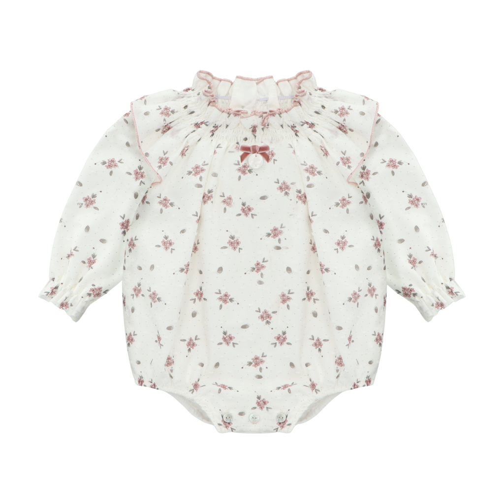 Long-sleeved romper with a ruffled collar, front bow detail and a delicate all-over floral print.