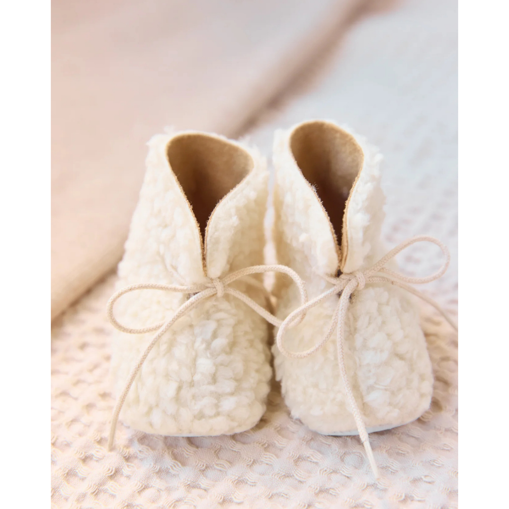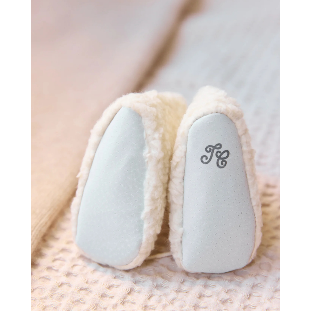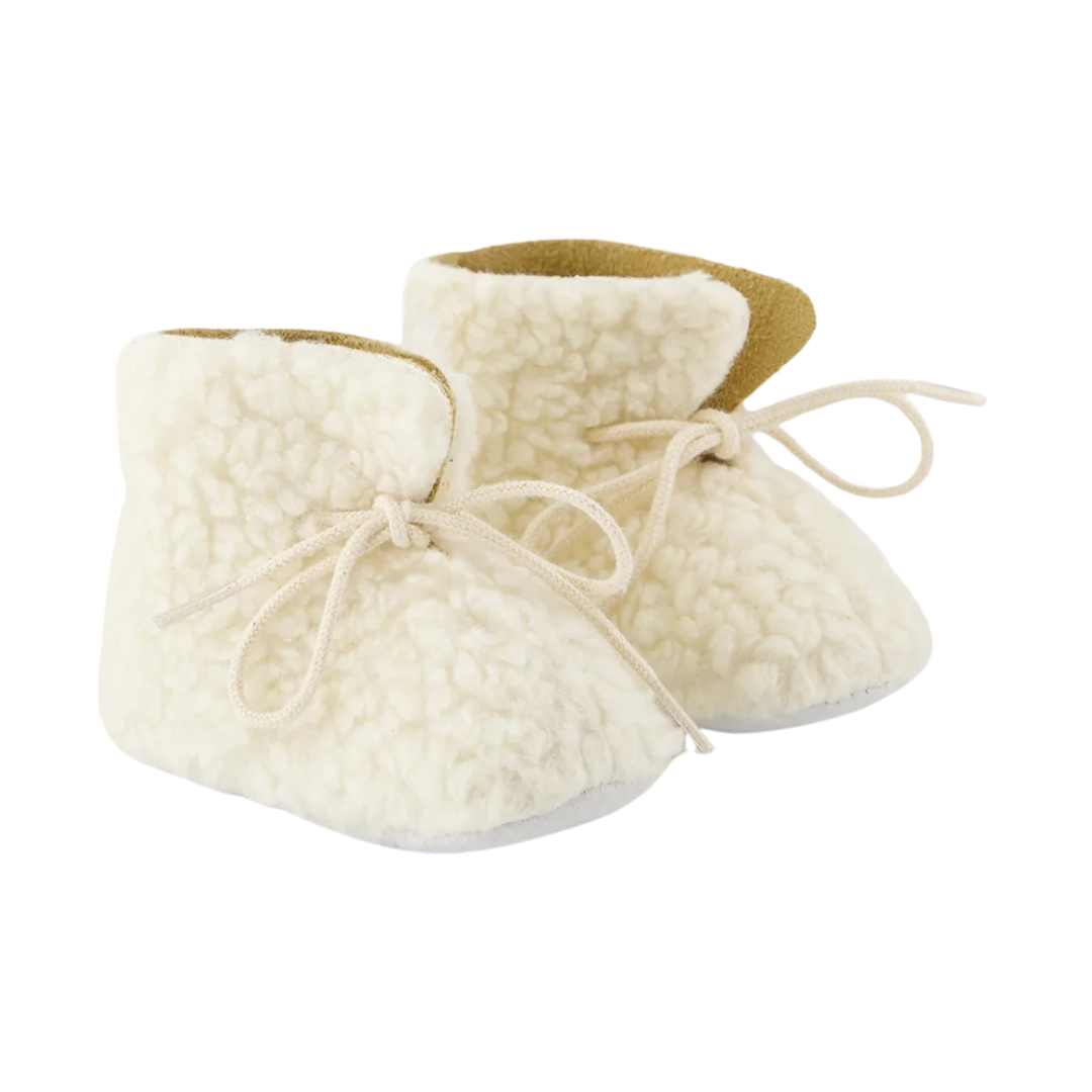 These slippers are made of imitation fur to wrap the feet in sweetness. A delicate lace brings a refined touch to this cocoon model, perfect to accompany the first days with tenderness.