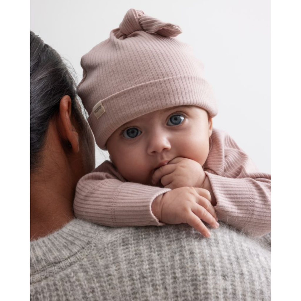 Pale rose ribbed hat.