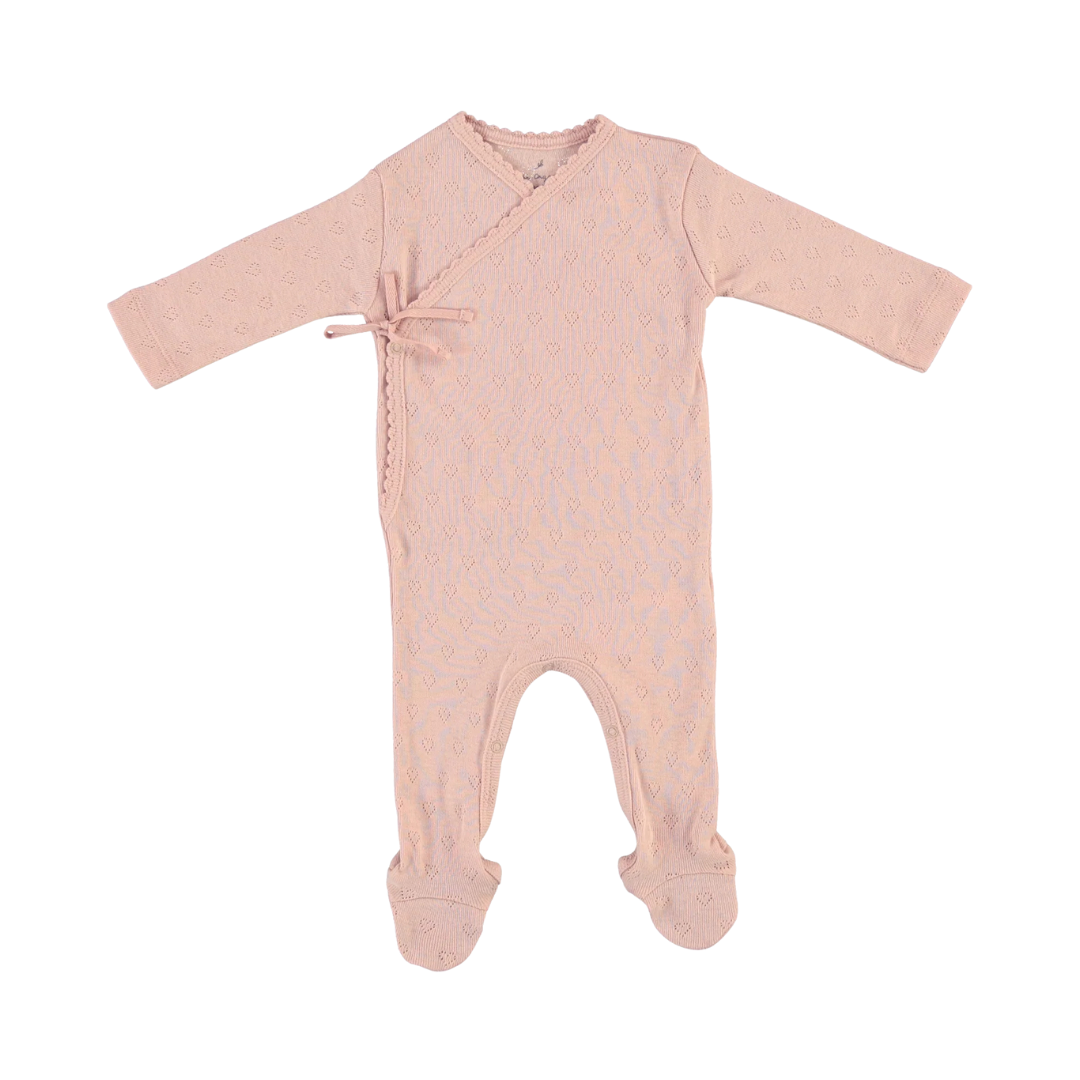 Bebe wrap footie in the softest organic cotton pointelle features a wrap opening, long sleeves, covered toes, and snaps for an easy change. This overall is the ultimate item for all babies and more especially for newborns.