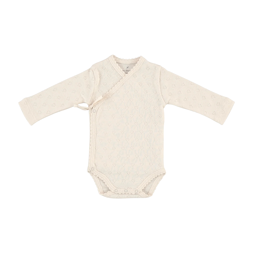 The Bebe wrap onesie is the ultimate item for all babies, and especially for newborns. Extremely soft onesie crafted from heart pointelle organic cotton, snaps for an easy change, and long sleeves to give extra comfort and coziness to the little ones.