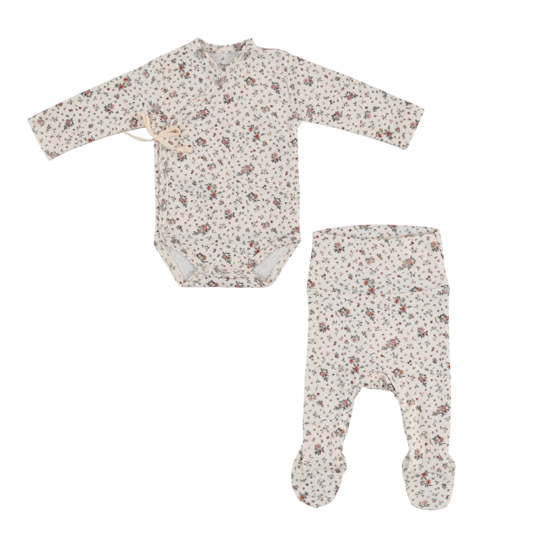 The blanca set is comfortable and cute! The beloved wrap onesie is the ultimate item for all babies, and especially for newborns. Extremely soft, crafted from organic cotton in a signature retro floral print onesie has snaps for an easy change and long sleeves to give that extra comfort and cosiness to the little ones. The footed leggings in signature retro floral print features a high waistline, covered toes, and a comfortable, snug fit. These footed leggings are the ultimate item for all babies, and especially for newborns.