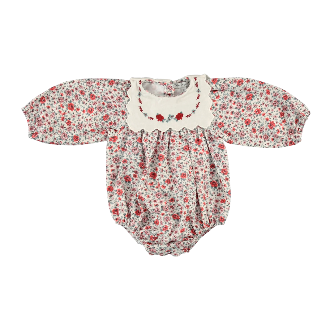 Vintage-inspired Clementine romper in nostalgic red floral print features a comfortable balloon fit, vintage-inspired square bib collar with signature floral embroidery, and long puff sleeves. Crafted from the softest organic cotton. Closes with mother-of-pearl buttons in the back and snaps between legs for easy change.