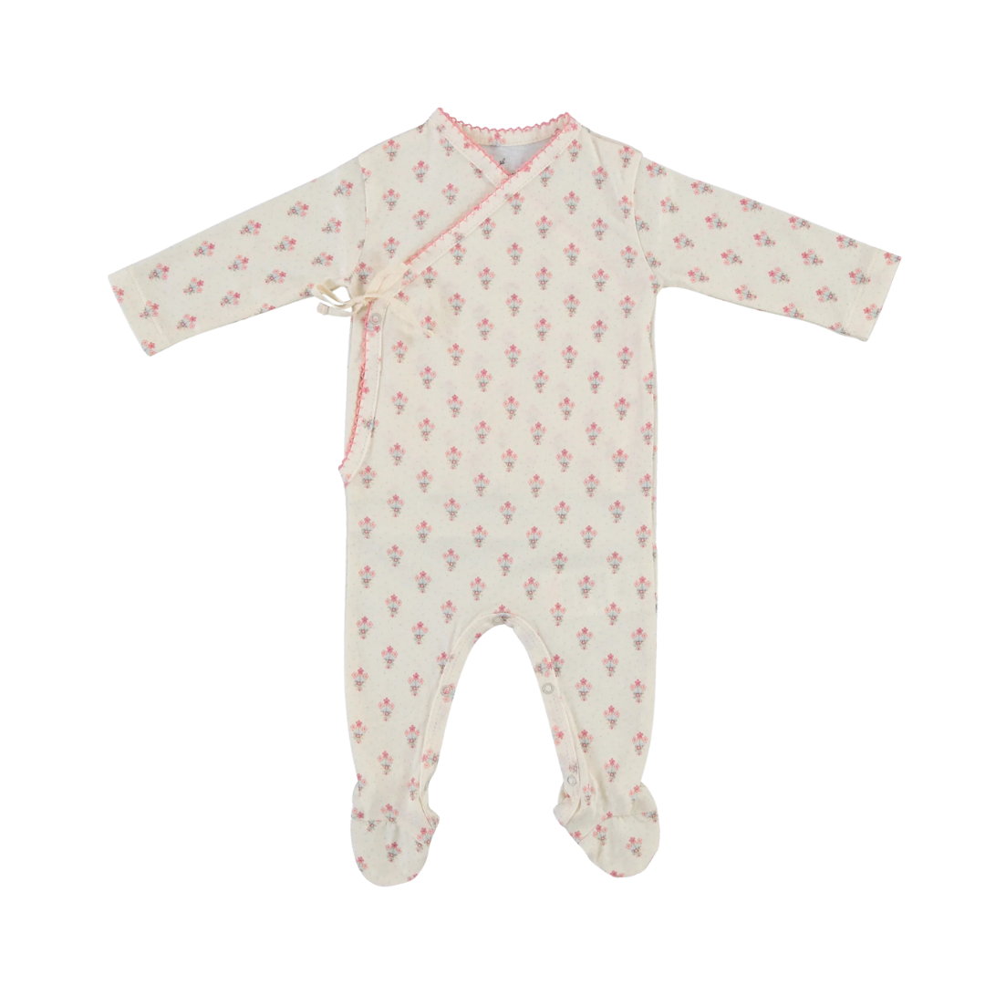 Adorable cotton jersey essential line in gentle bouquet print. Lovely Mora wrap overall with lovely contrast lace finishing is the ultimate item for all babies, and especially for newborns. Extremely soft and stretchy overall in cotton jersey with covered toes, snaps for an easy change, and long sleeves to give that extra comfort to the little ones. Make a full set with other Mora line products.