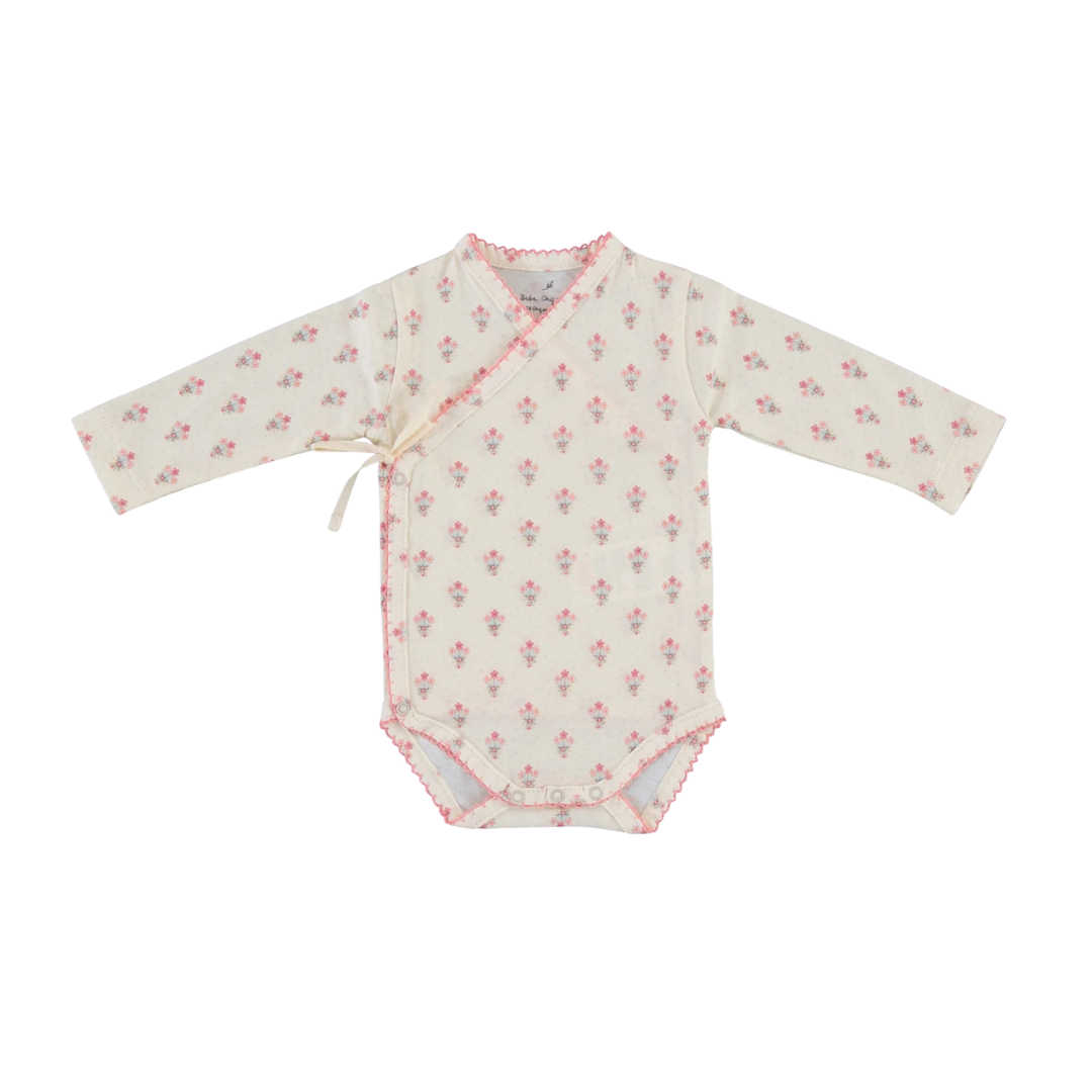 Lovely Mora wrap onesie in gentle bouquet print with lovely contrast lace finishing is the ultimate item for all babies, and especially for newborns. Extremely soft, crafted from cotton jersey onesie has snaps for an easy change and long sleeves to give that extra comfort and cosiness to the little ones. Perfect match with Mora footed leggings.