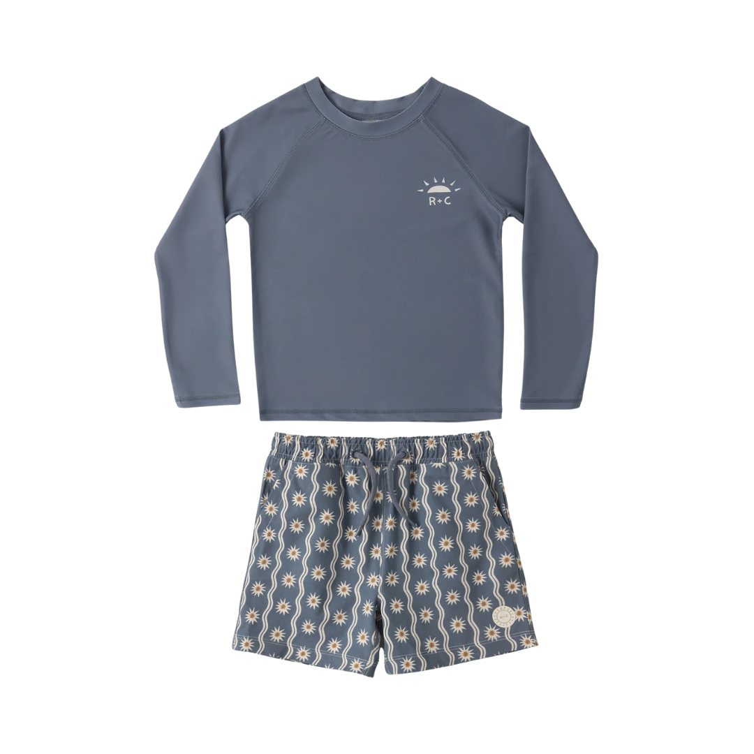 This long sleeve rashguard and boardshort set is perfect for endless pool and beach days. The shorts feature an elastic waistband with adjustable drawstring and pockets.