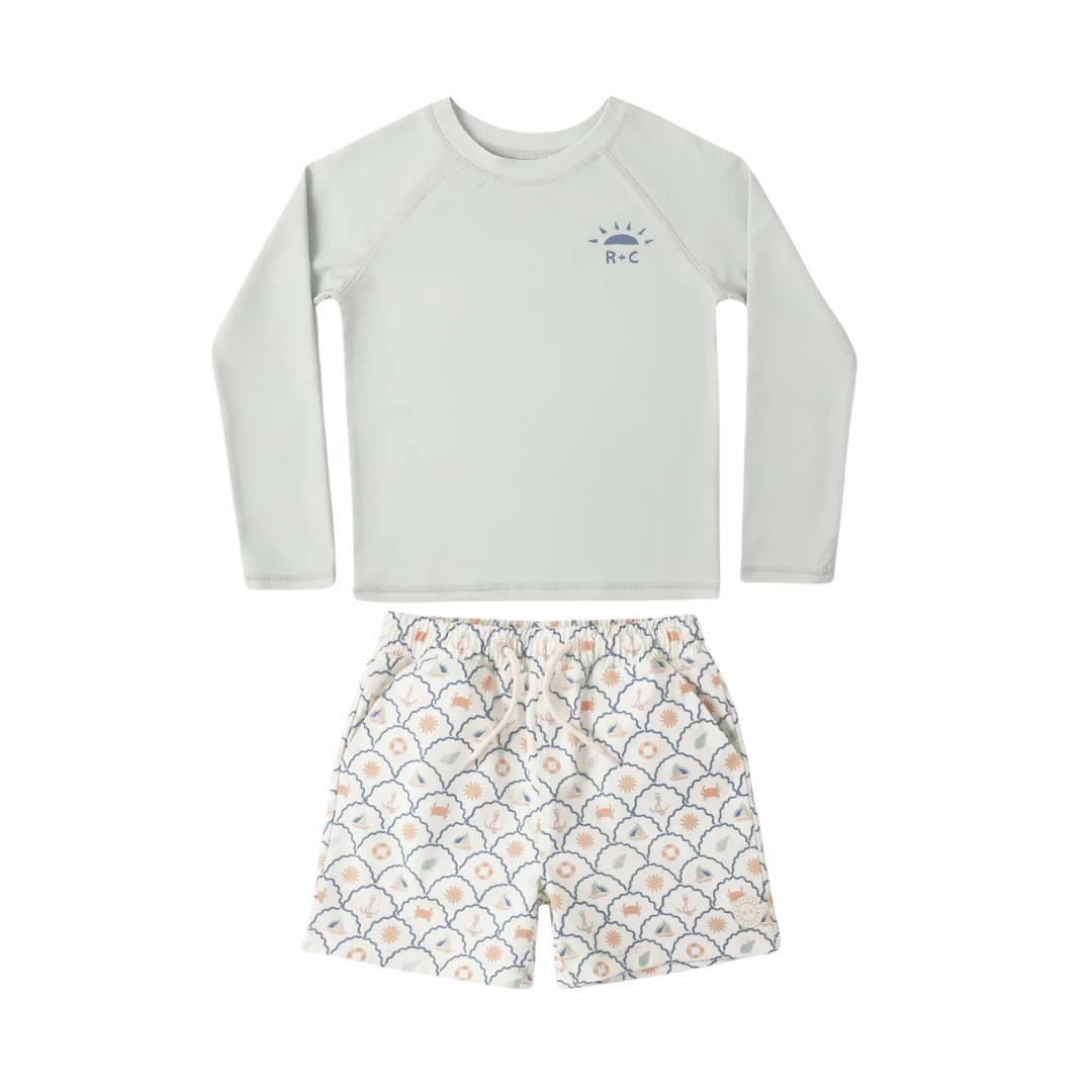 This long sleeve rashguard and boardshort set is perfect for endless pool and beach days. The shorts feature an elastic waistband with adjustable drawstring and pockets.
