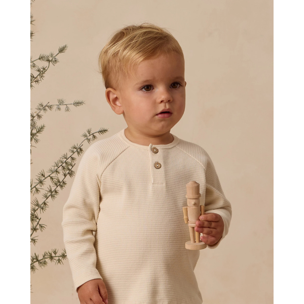 Long sleeve boxy fit shirt with buttons along the center front paired with comfortable corduroy pants with an elastic waistband and leg openings, adjustable drawstring, and side patch pockets.