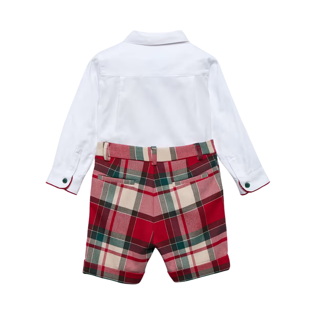 Three piece set comprised of a white long-sleeved button down, plaid shorts and a plaid bow tie.