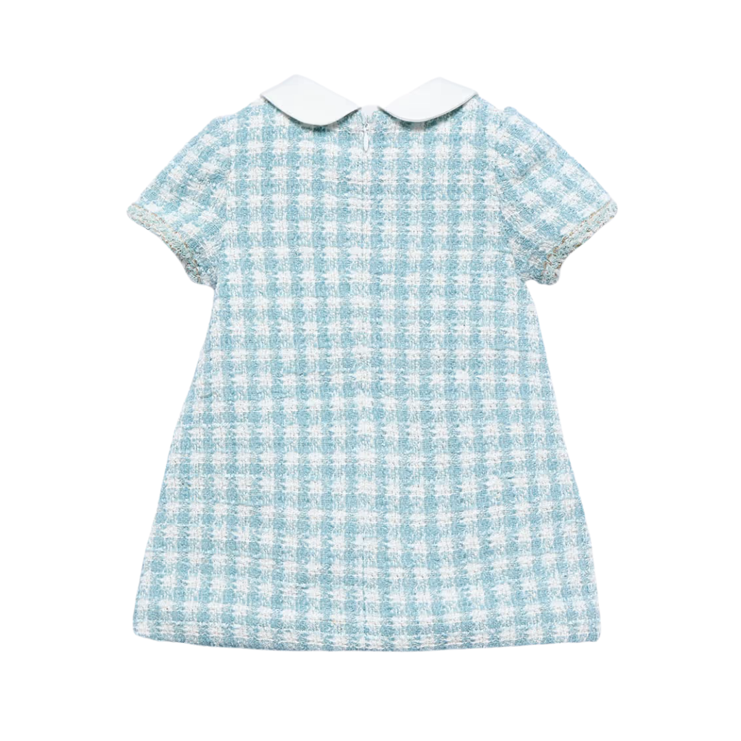 Blue tweed like dress with gold accent buttons on the front and a white rounded collar.