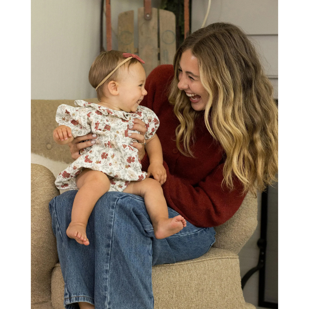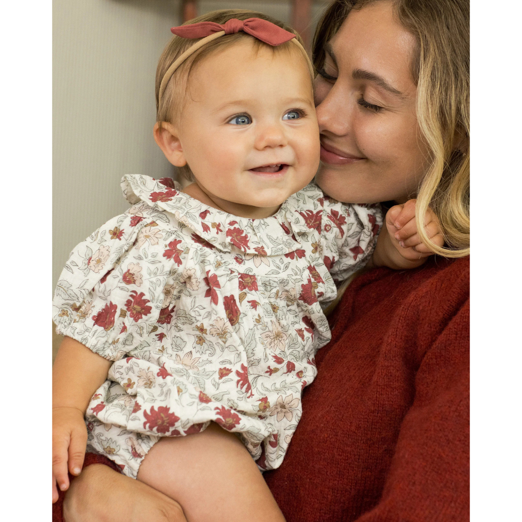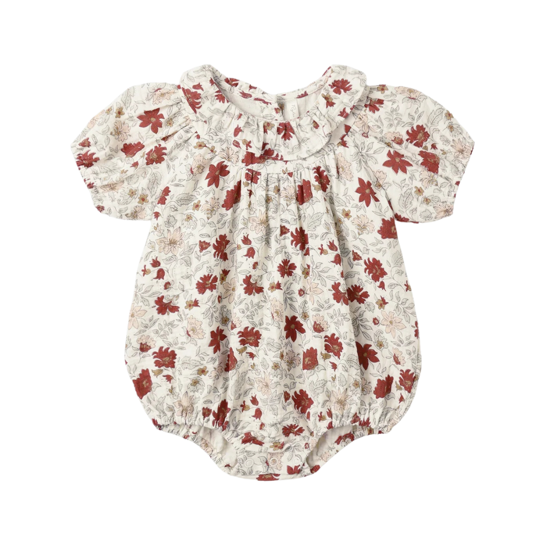 Bubble romper featuring elasticized sleeve openings and leg openings to create a bubble-like silhouette. Dainty ruffle along the neck and snaps along bottom opening. Featuring a 'holiday floral' print on an 'ivory' hue.