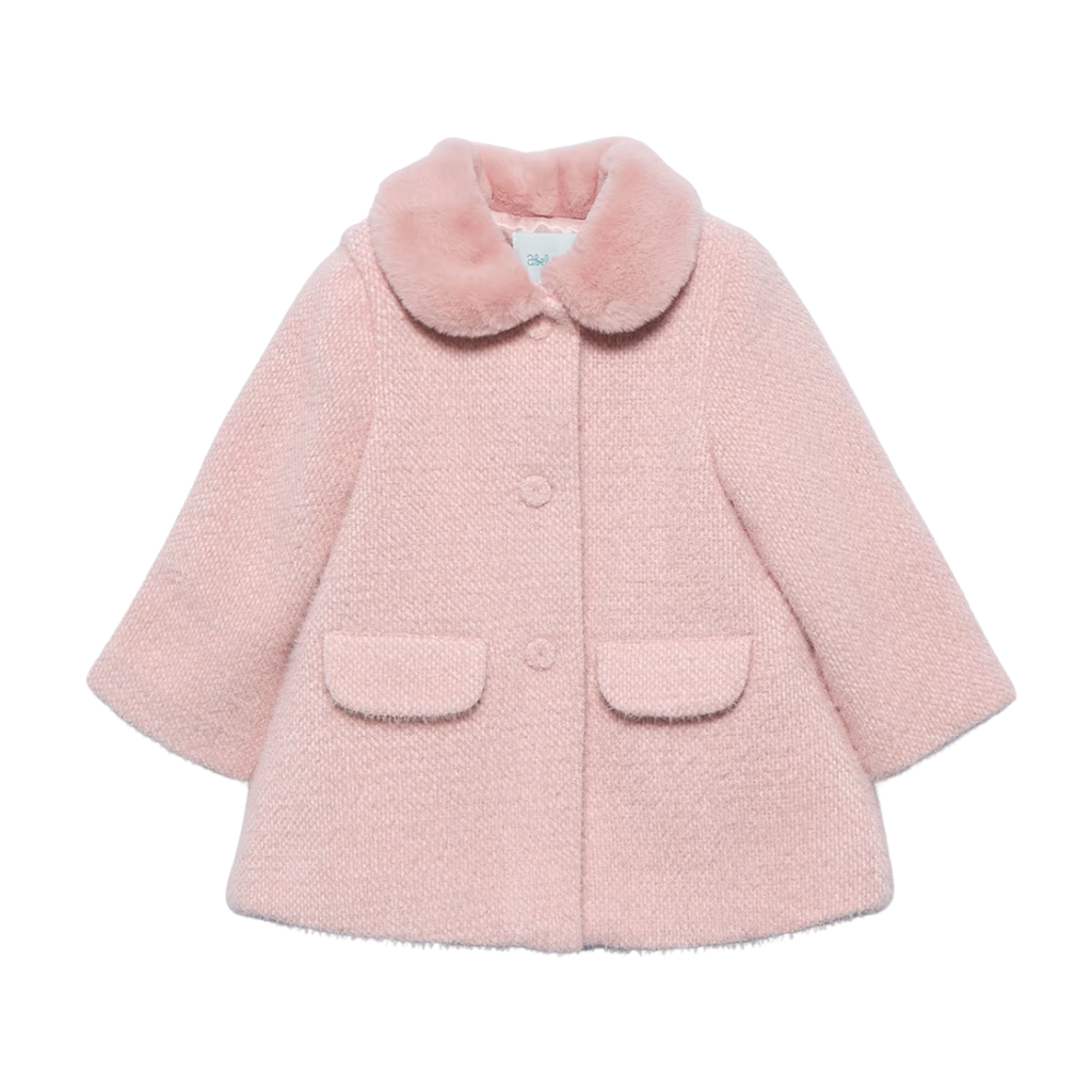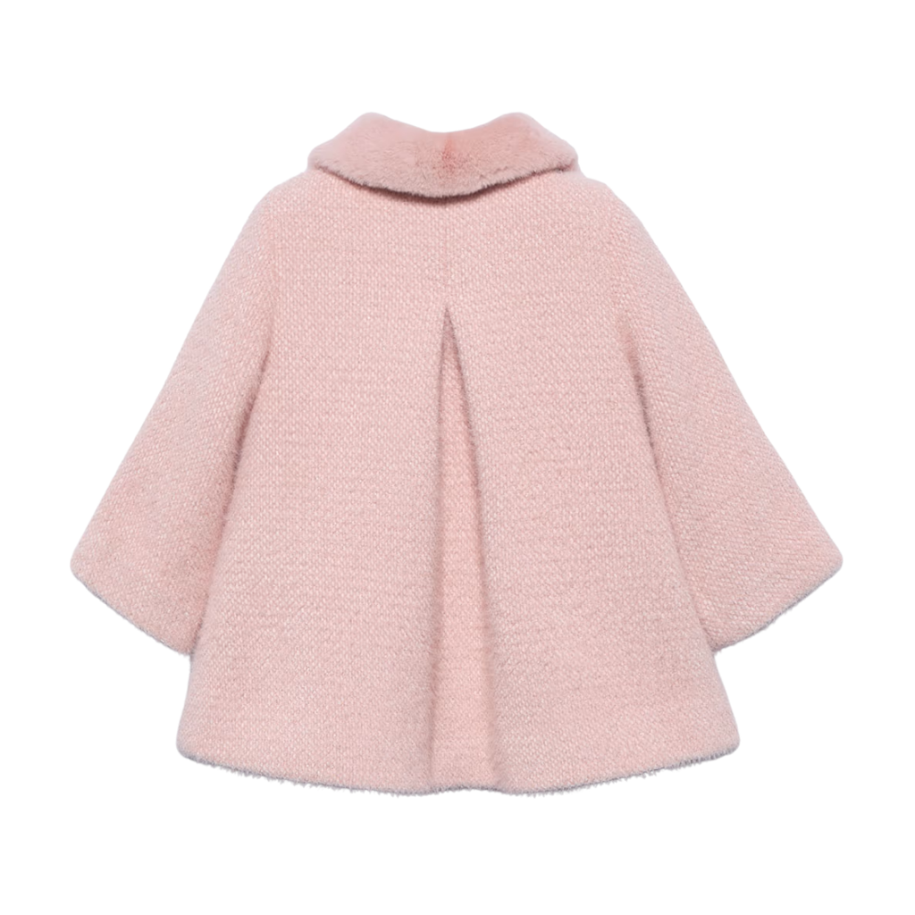 Pink peacoat with faux pockets on the front, front button closure and a faux fur collar.