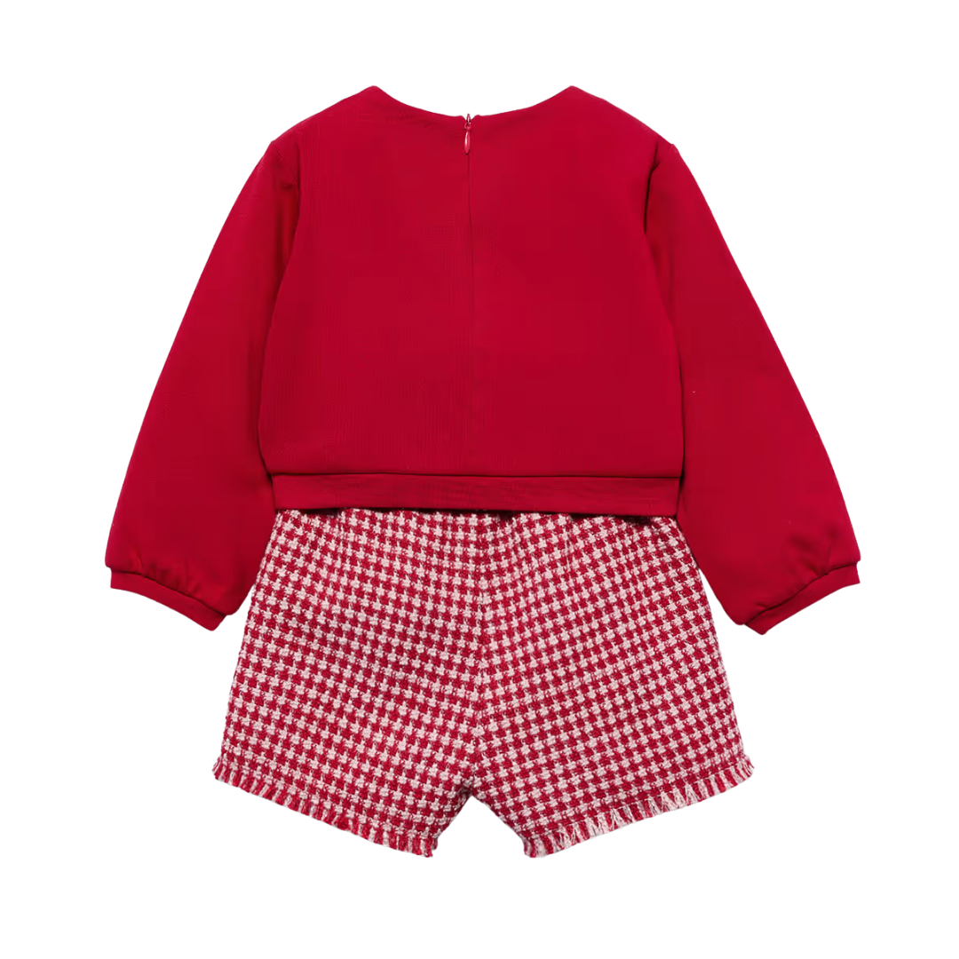 Two piece set comprised of a long sleeved blouse and shorts with an all over checked print in red.