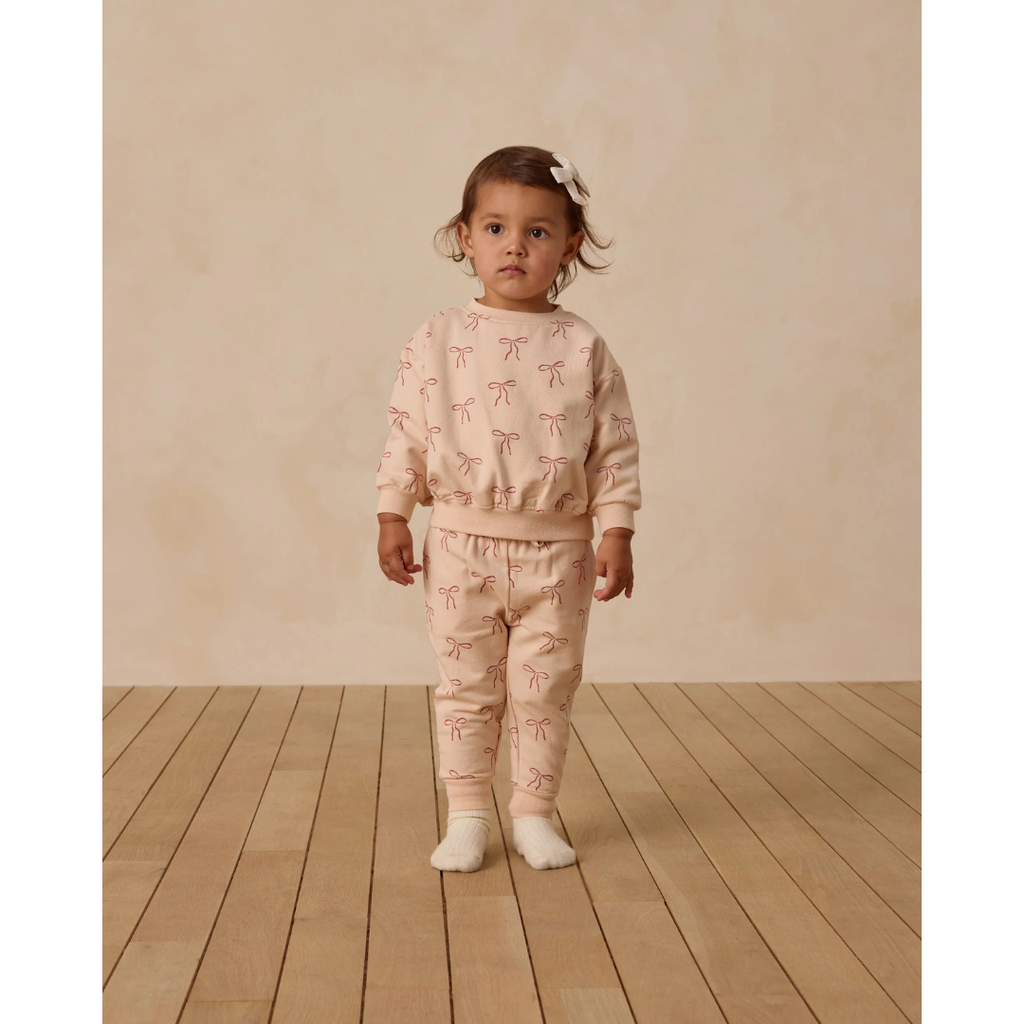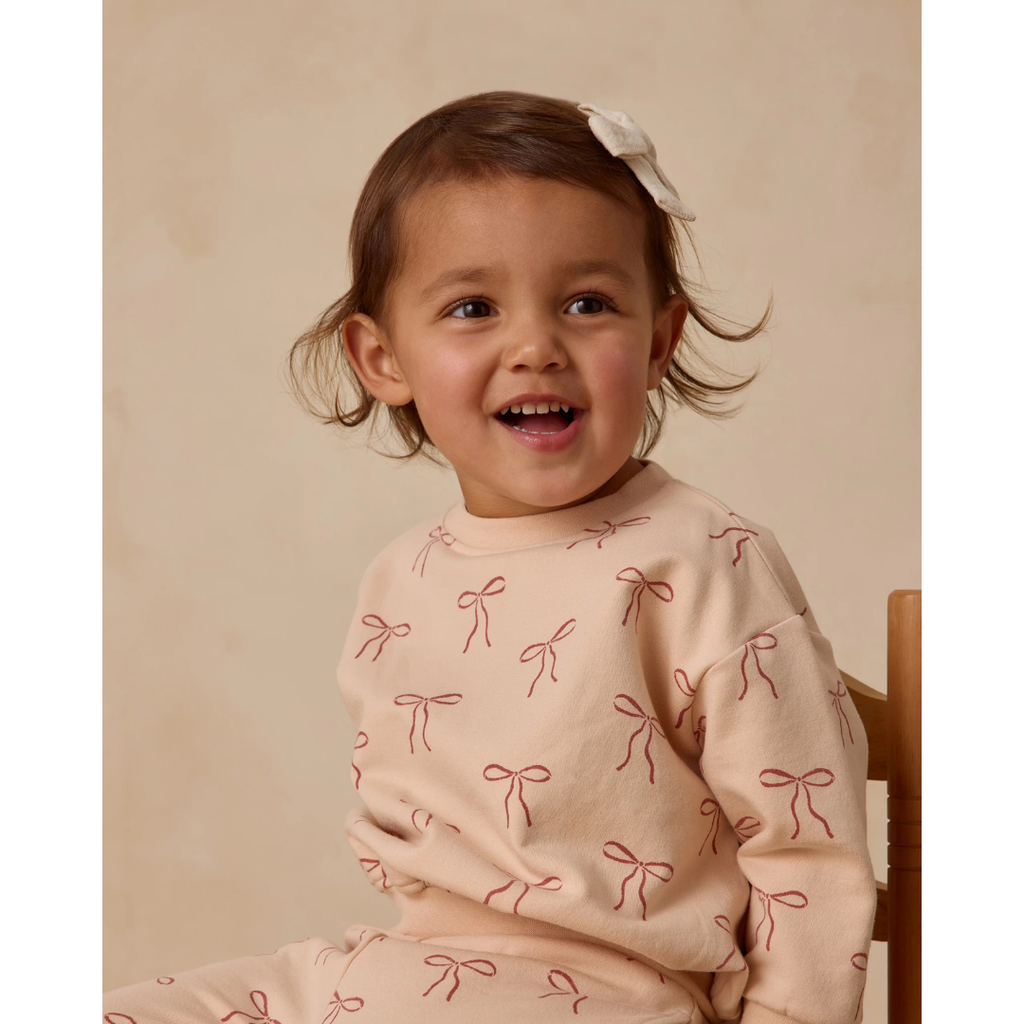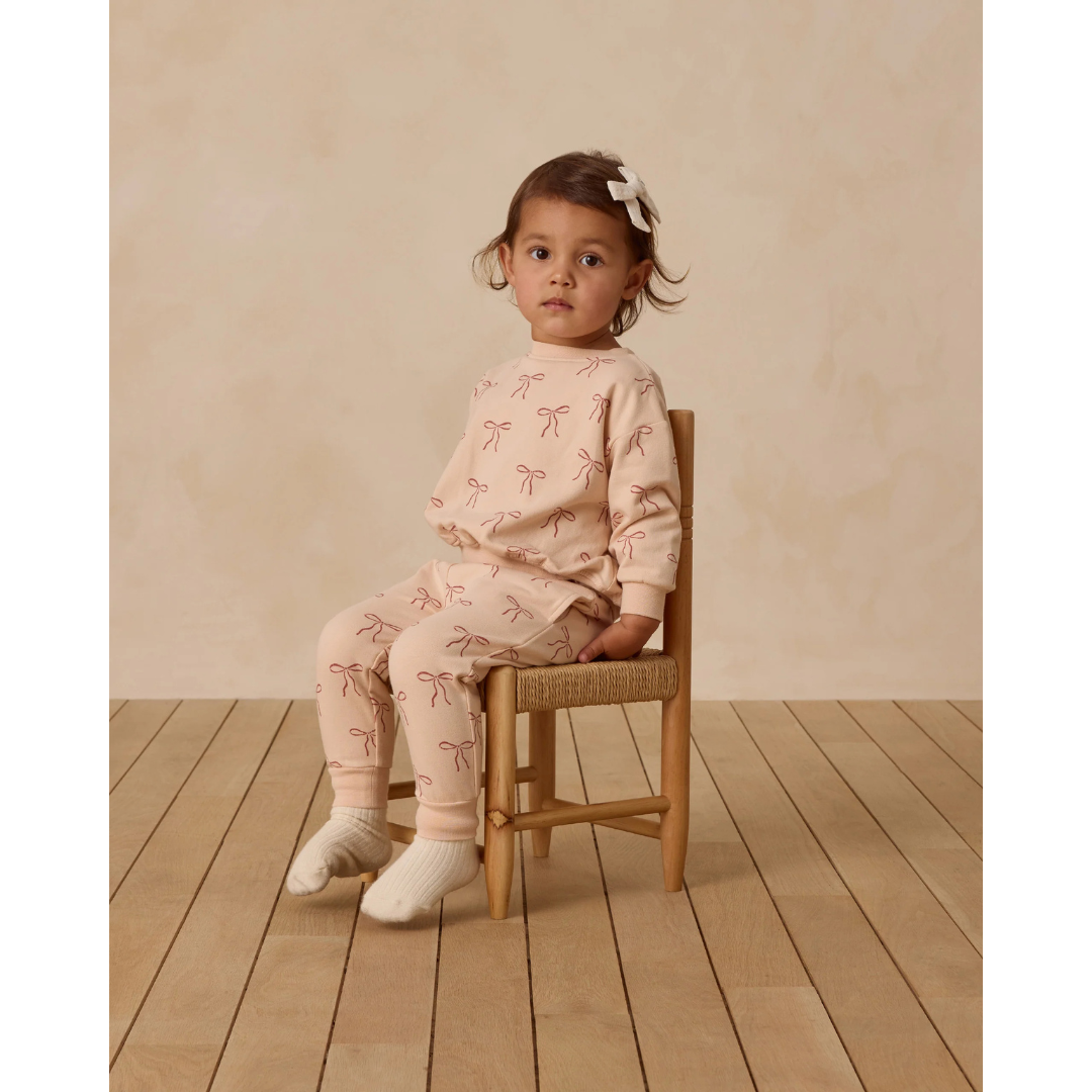 This relaxed fleece sweat set is a cozy essential for cooler days. Featuring a ‘red bows’ print on an 'antique' hue.