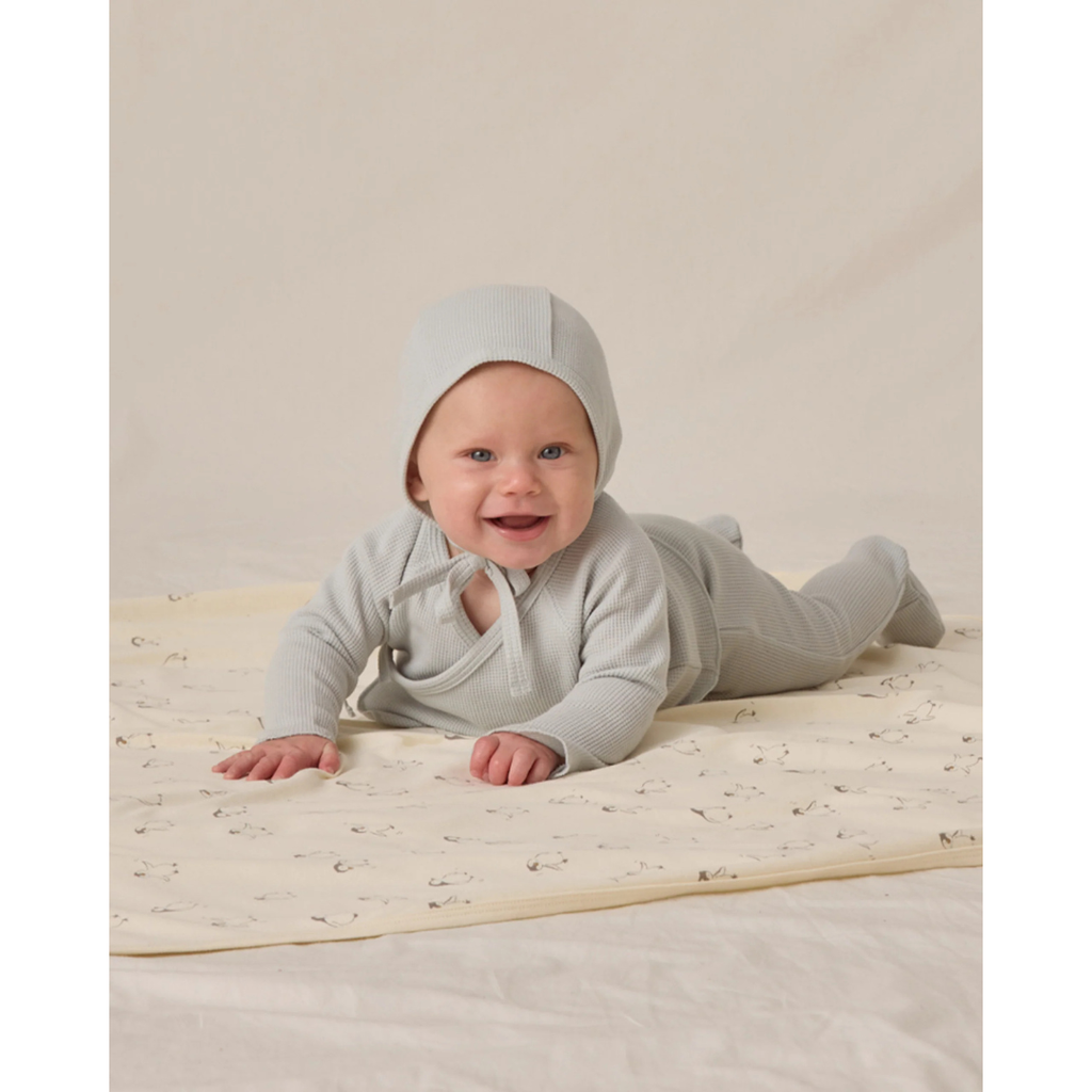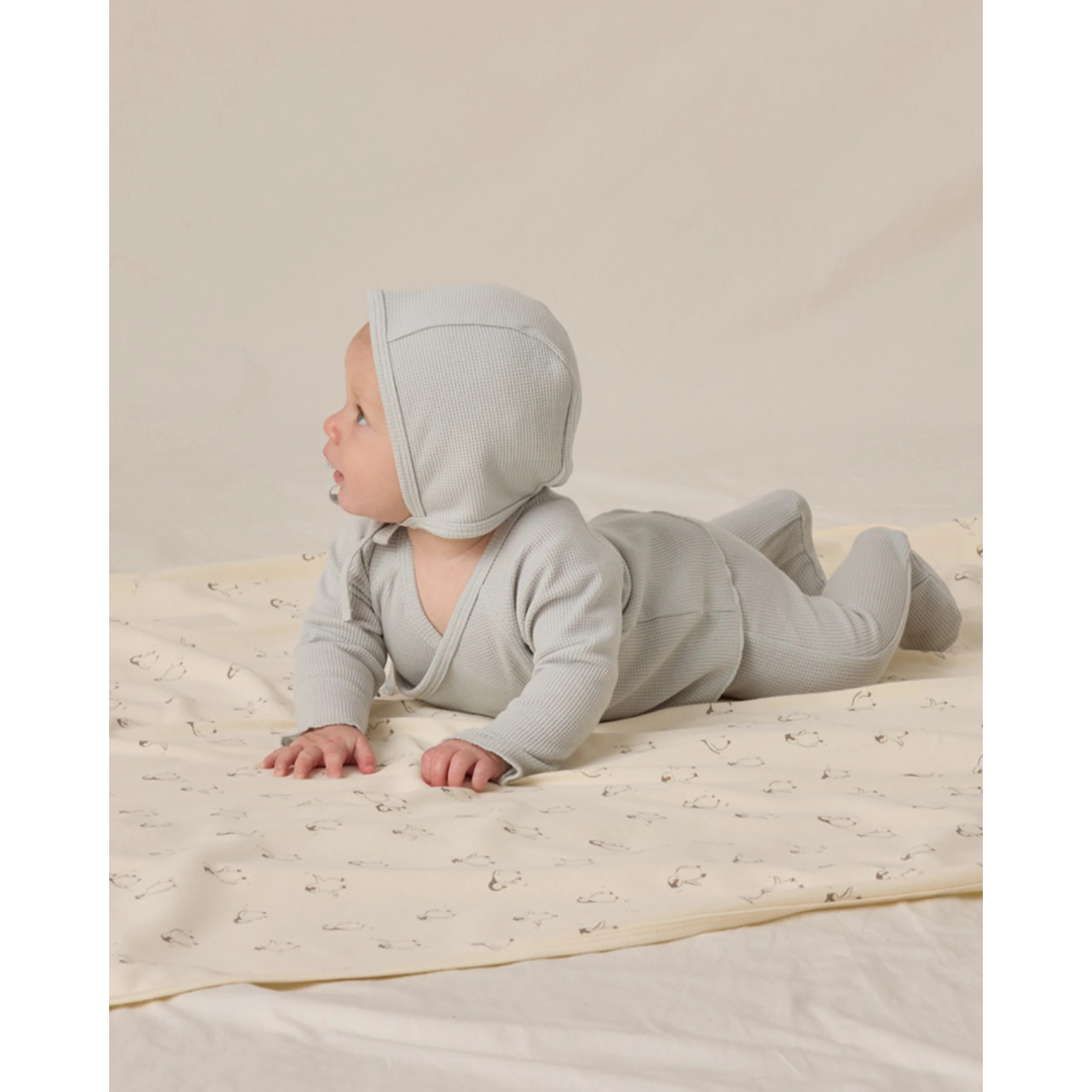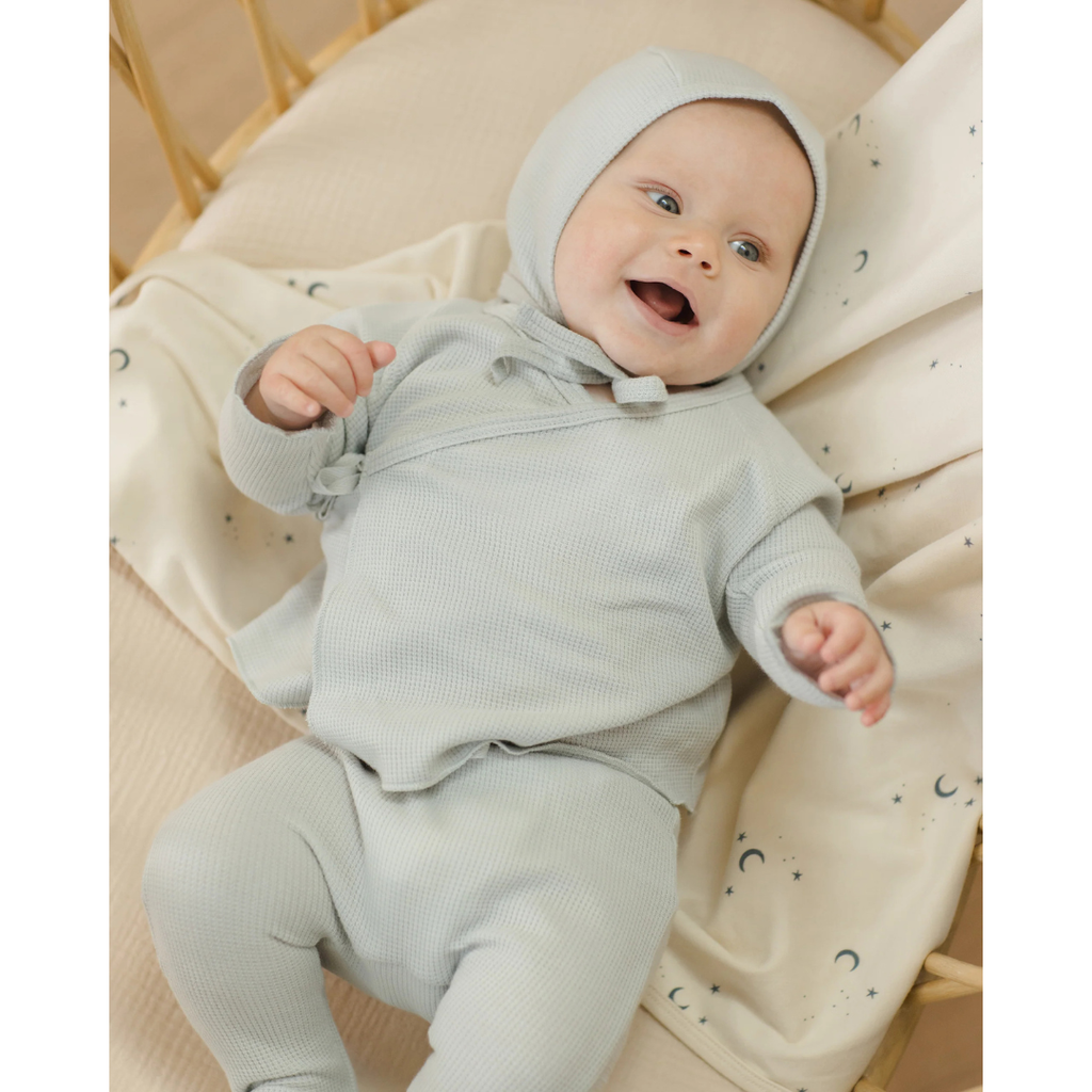 This Take Home Set in soft, lightweight waffle fabric is the perfect outfit for welcoming your newborn. This sweet set includes a bonnet, a wrap snap and tie top, and footed drawstring pants.