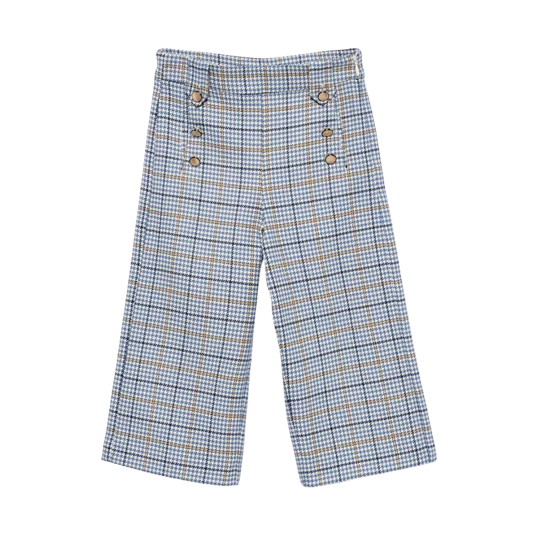 Plaid pants with decorative gold buttons on each side.