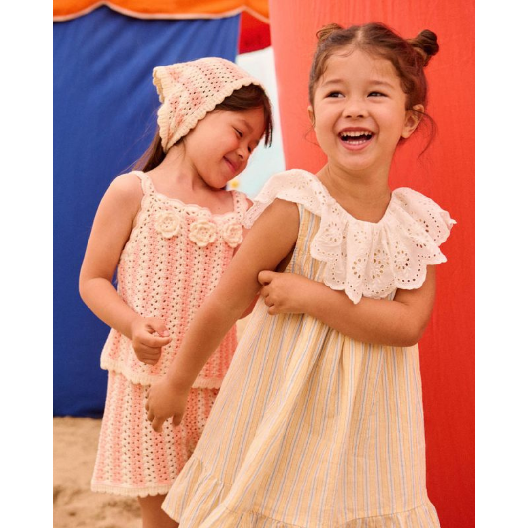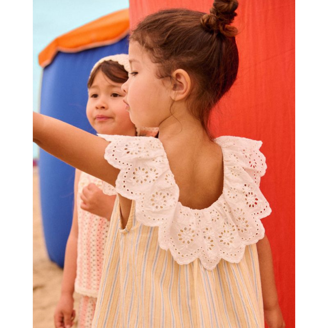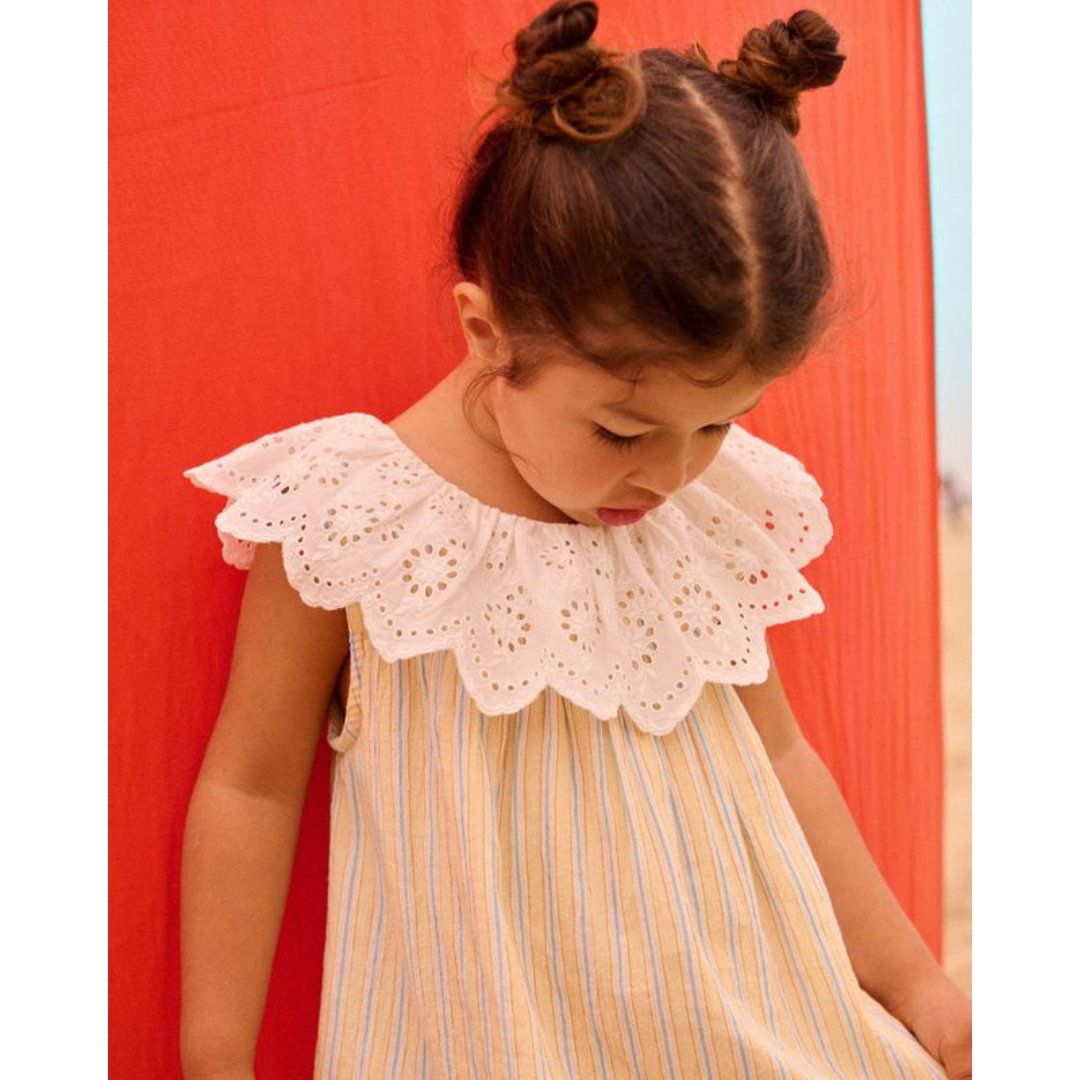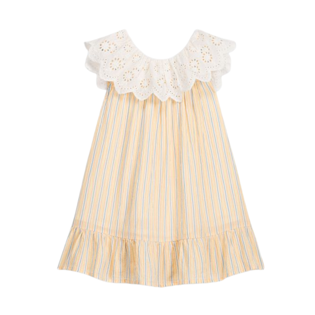 Sleeveless dress desiged with a scalloped eyelet collar and a ruffled hem at the bottom.