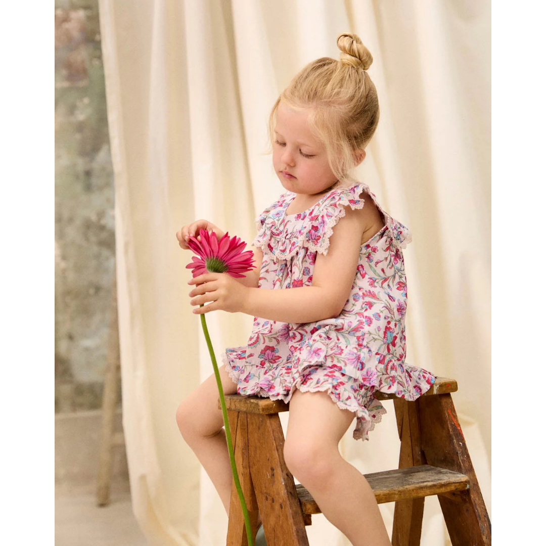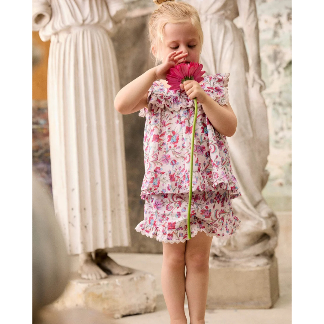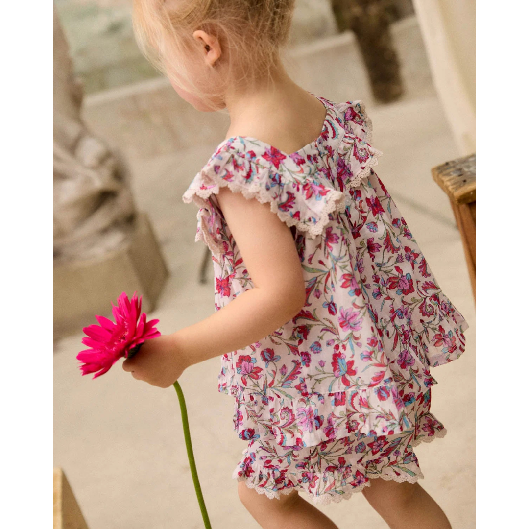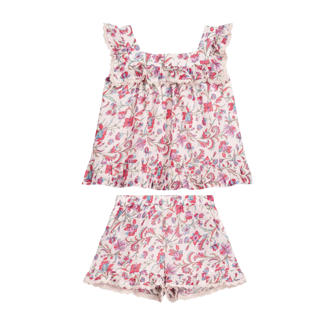 Floral cotton set comprised of a sleeveless blouse and shorts. The top features a squared neckline with ruffled and laced edges on the front yoke and armholes and a partial button placket at the back. The shorts feature an elasticated waist and lace edges at the bottom.