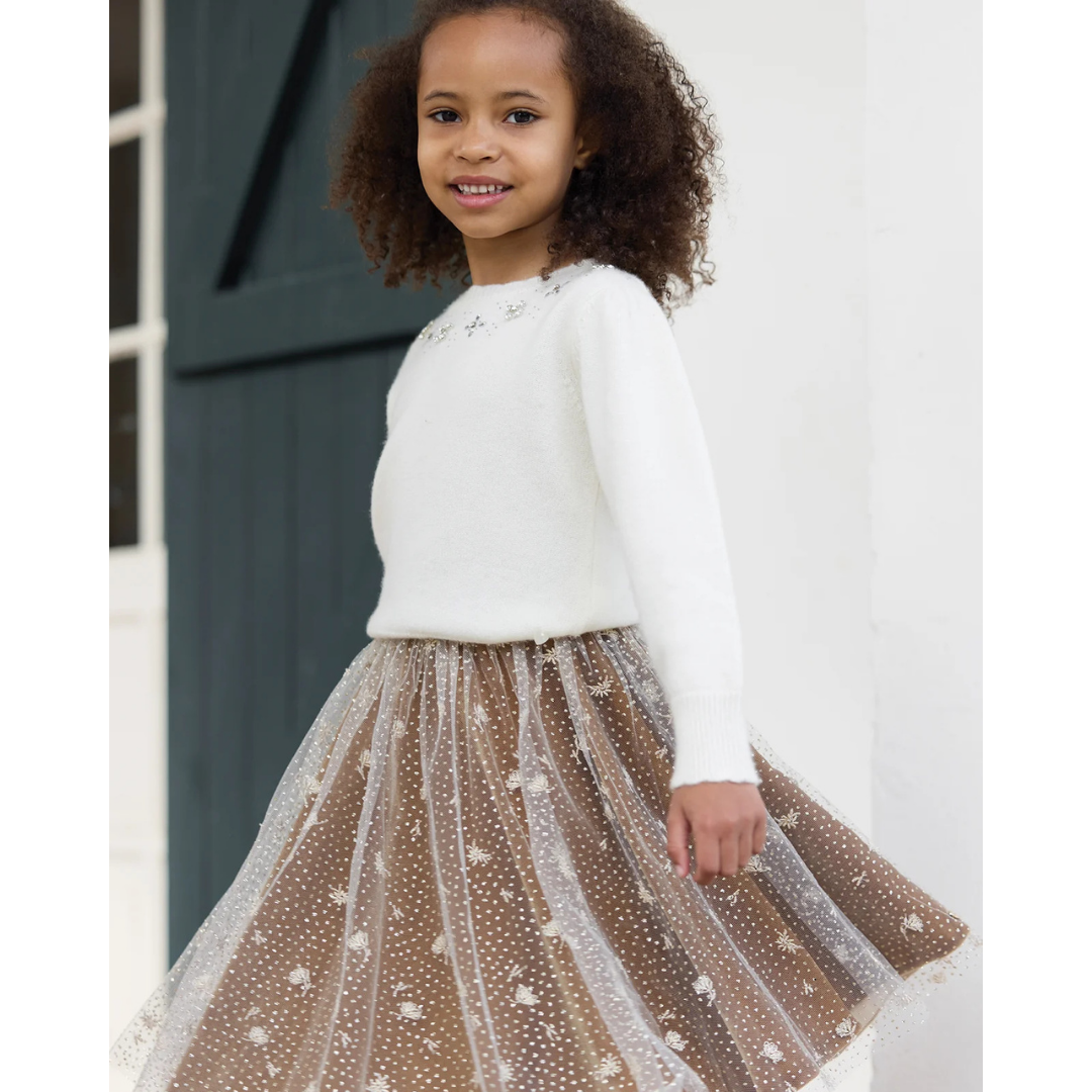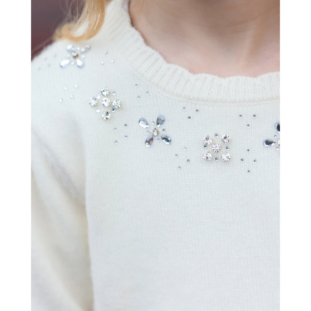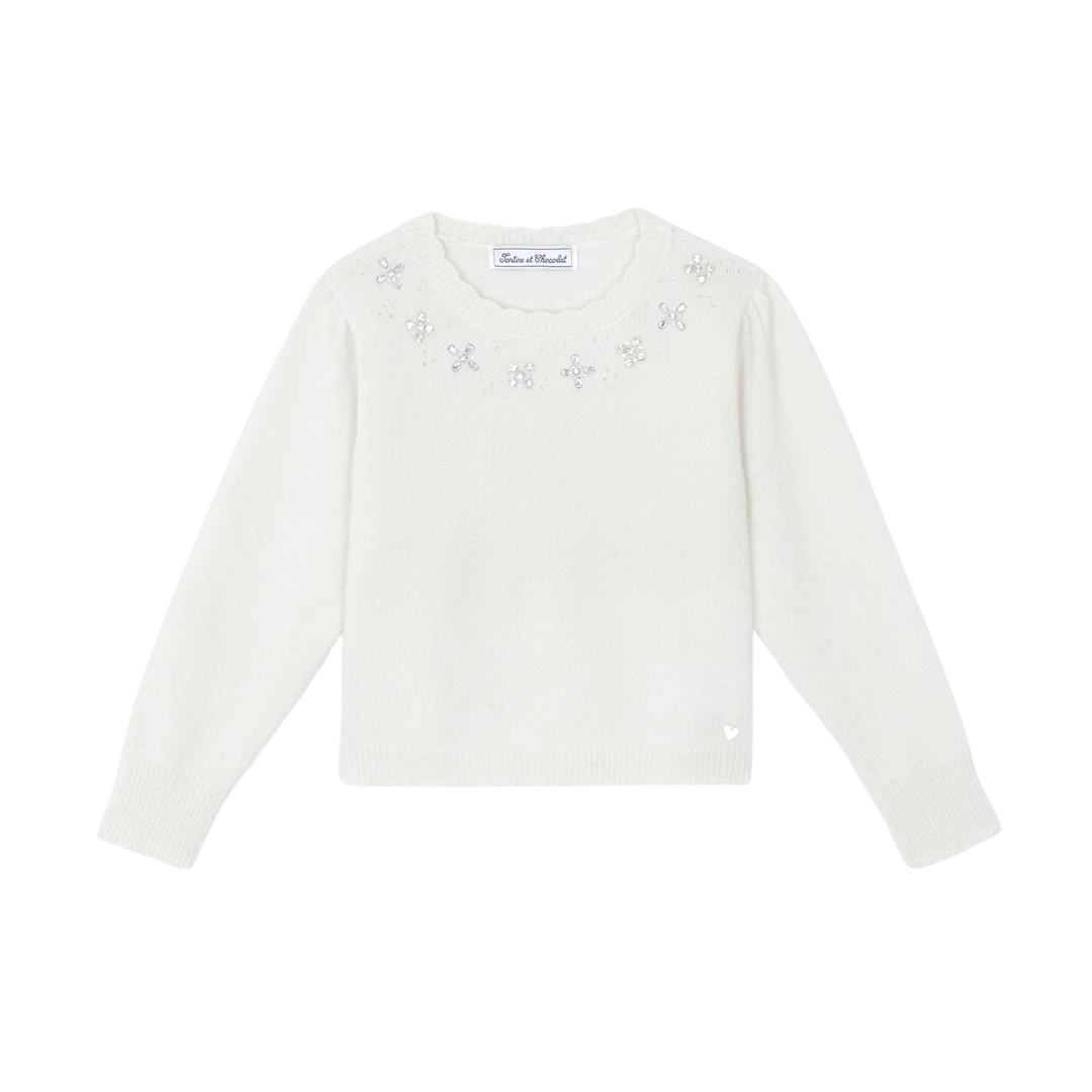 This wool sweater is adorned with sequins around the collar, bringing a precious and festive touch to this model that is both tender and elegant.