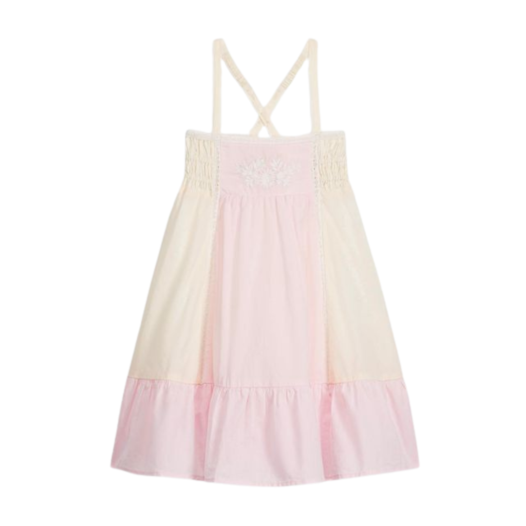 Sleeveless dress with embroidered details on the front, adjustable, elasticated straps that cross at the back and a large frieze-style ruffle at the bottom.