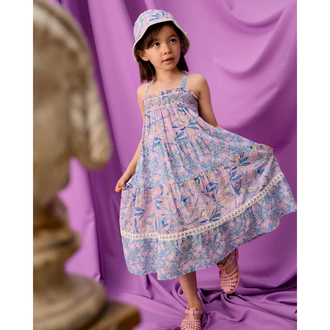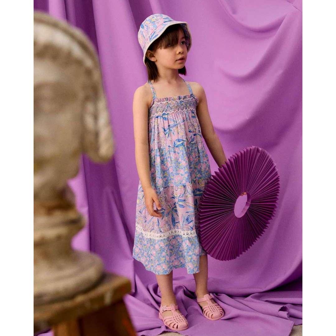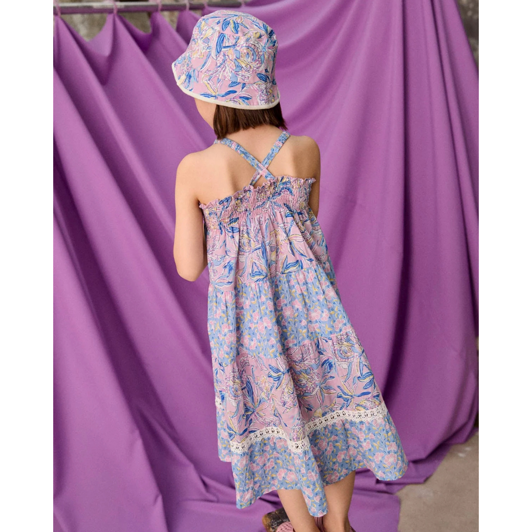Long floral cotton veil dress with hand-embroidered smocks on the top, adjustable, elasticated straps that cross at the back and a large frieze-style ruffle at the bottom.