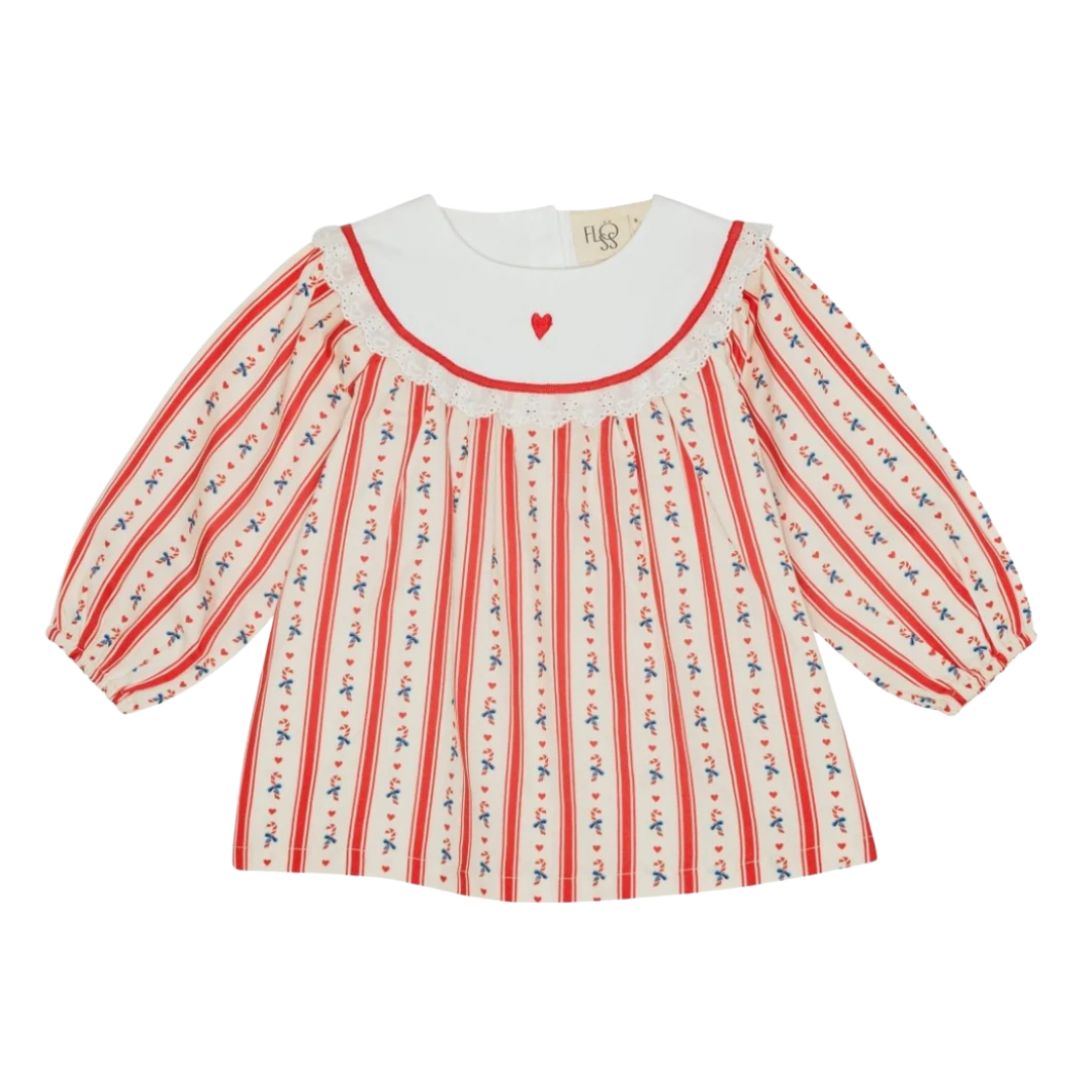Noelle Dress is made of soft cotton poplin with a cute Christmas-inspired print. The dress has a round neck and raglan sleeves with elasticated edges. On the white yoke is a cute lace frill, red ribbon and heart embroidery. The dress has a closure at the back with mother-of-pearl buttons.