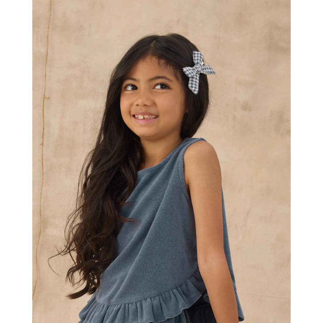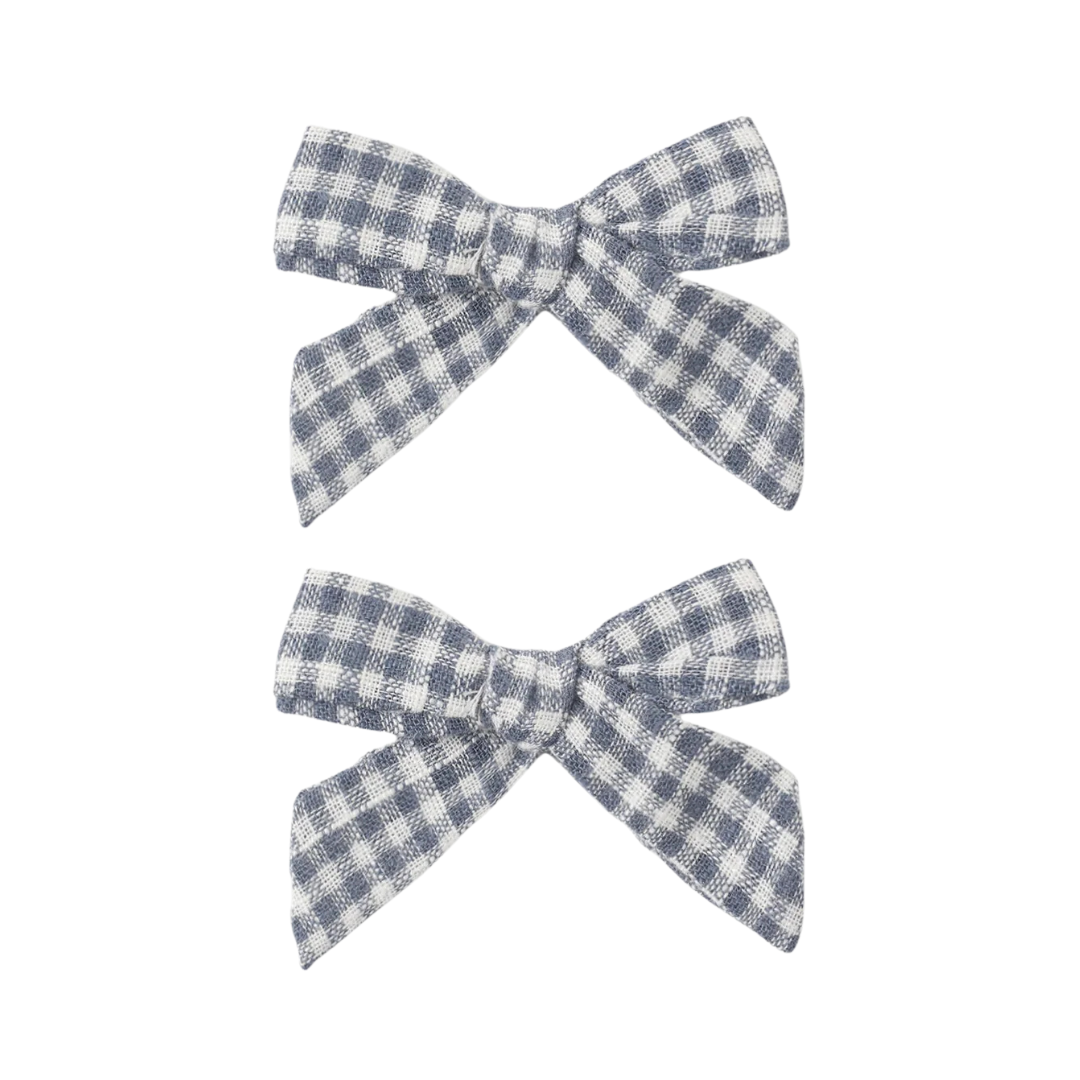 Adorable bow clips for babies and toddlers. Set of 2 bows in a marine gingham hue.