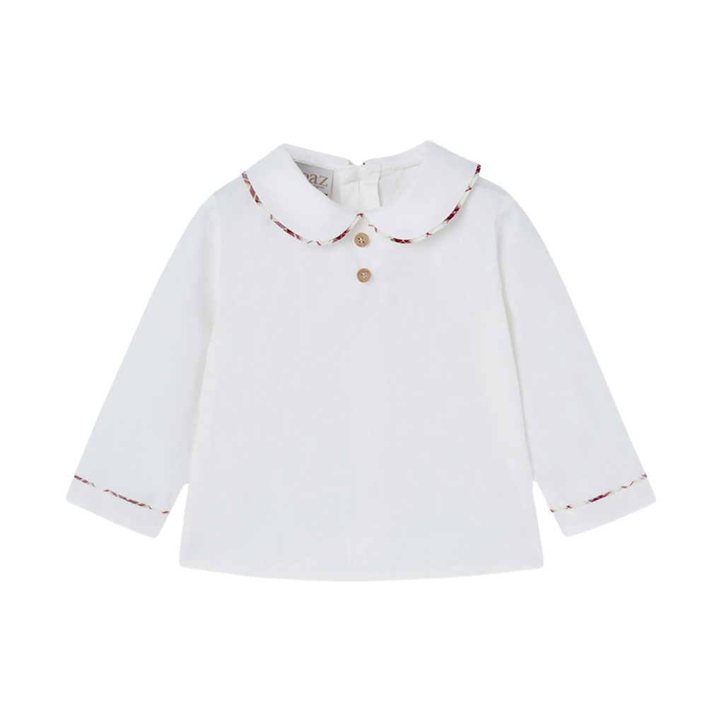 Long-sleeved top paired with checked overalls. The top features buttons down the fron and a pointed collar with a plaid trim. The overalls feature wood buttons.
