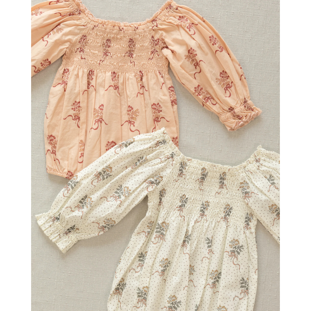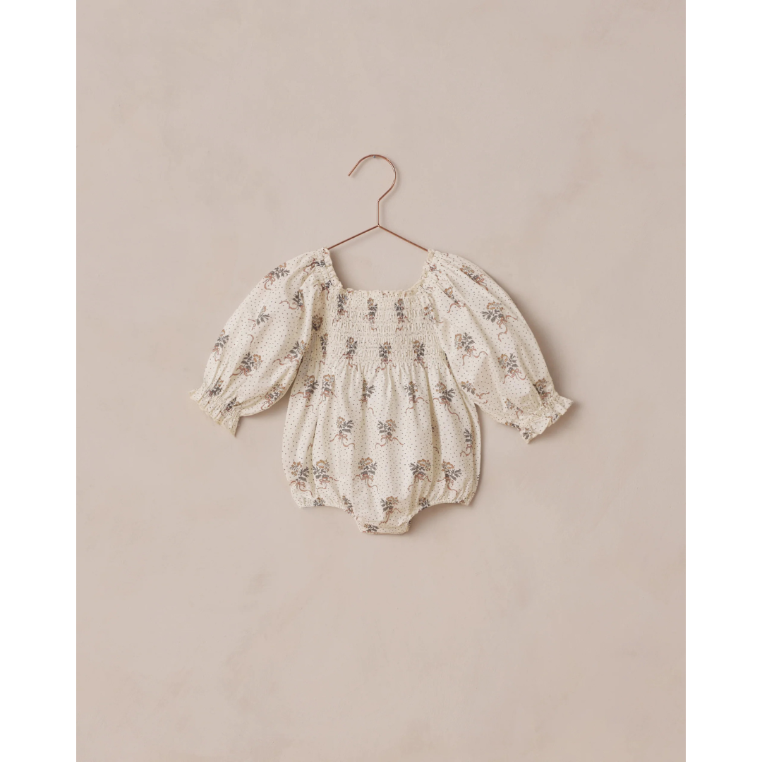 The Autumn Romper showcases a smocked empire bodice, voluminous bubbled long sleeves, and delicate ruffles at the neckline and cuffs.