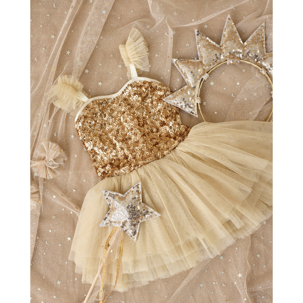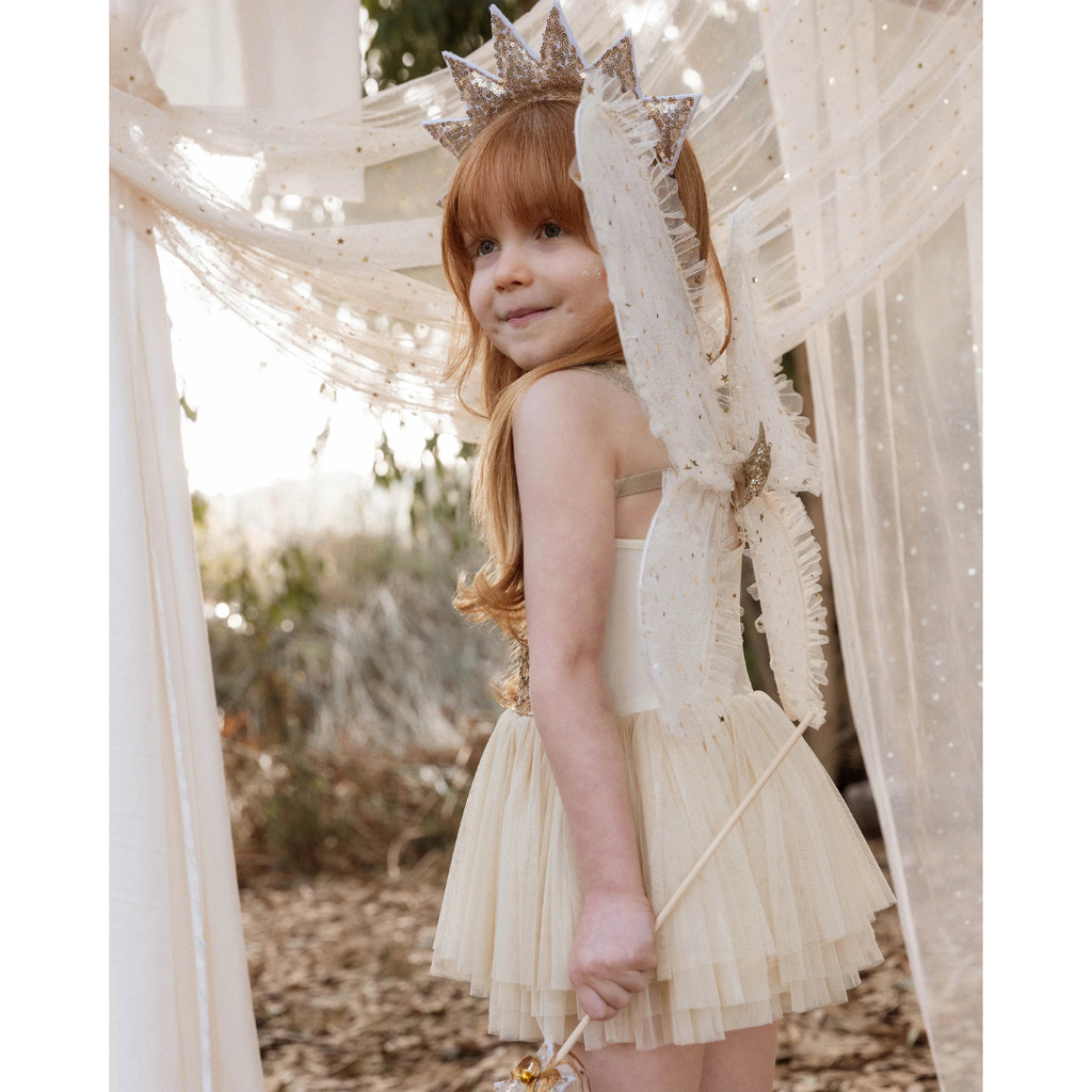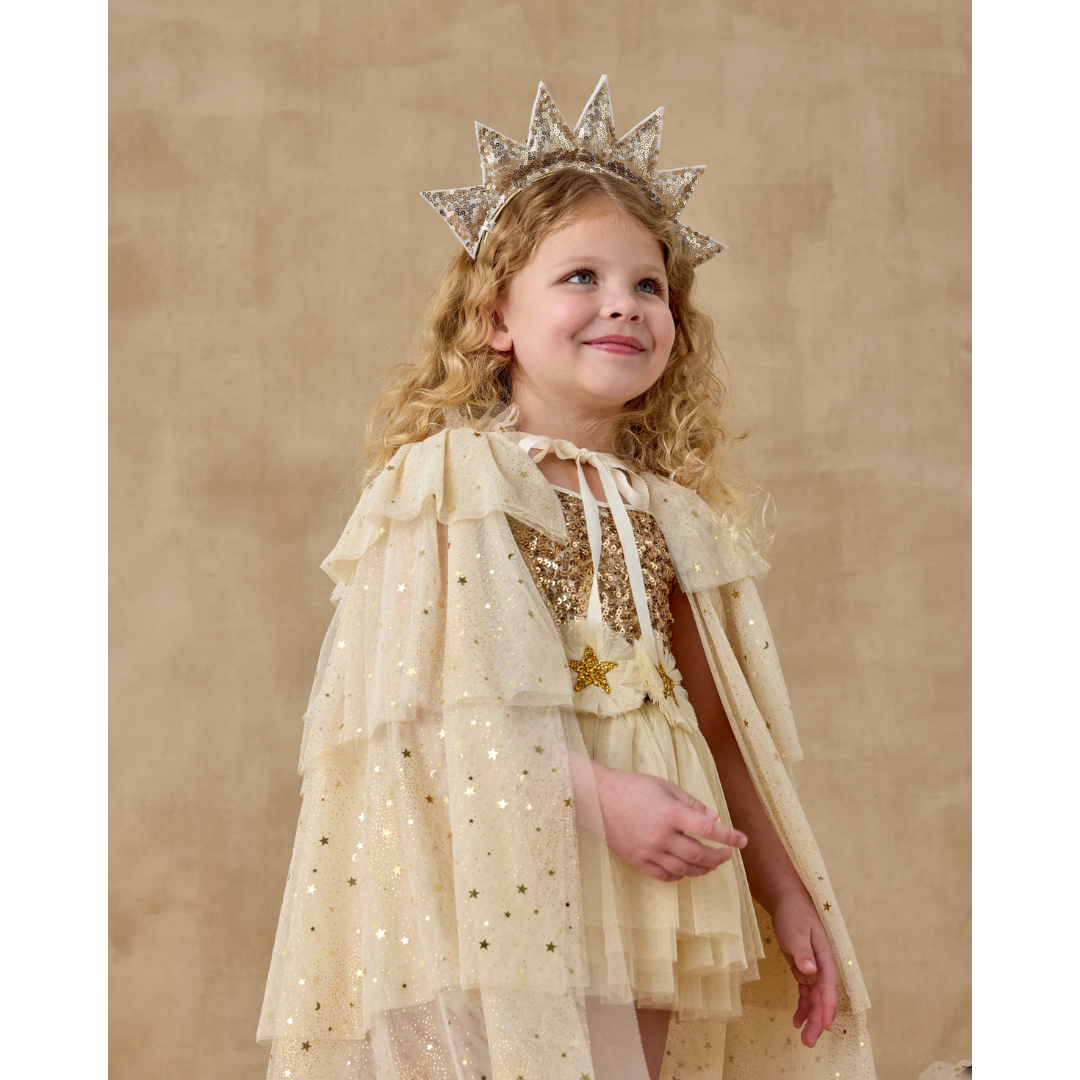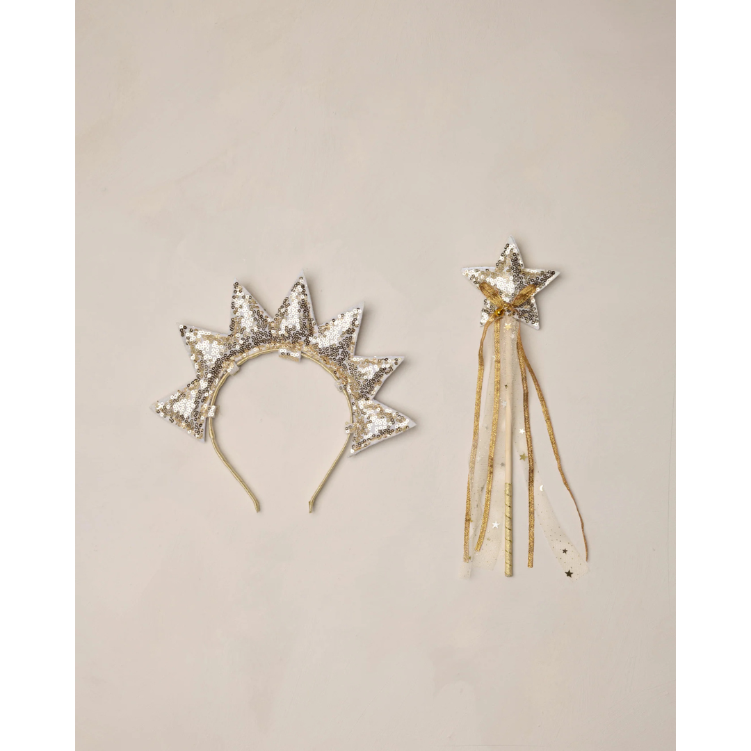 No dress-up look is complete without our sun crown ribboned headband and star wand—crafted from a wooden dowel and adorned with a tinkling bell and flowing tulle ribbon—perfect for every royal occasion. Featuring a 'gold sequin'.