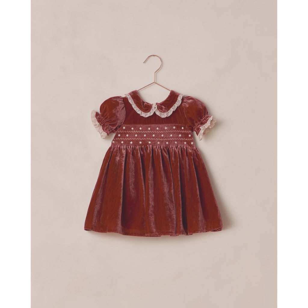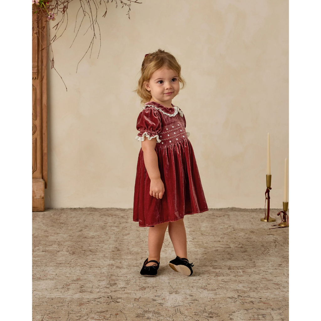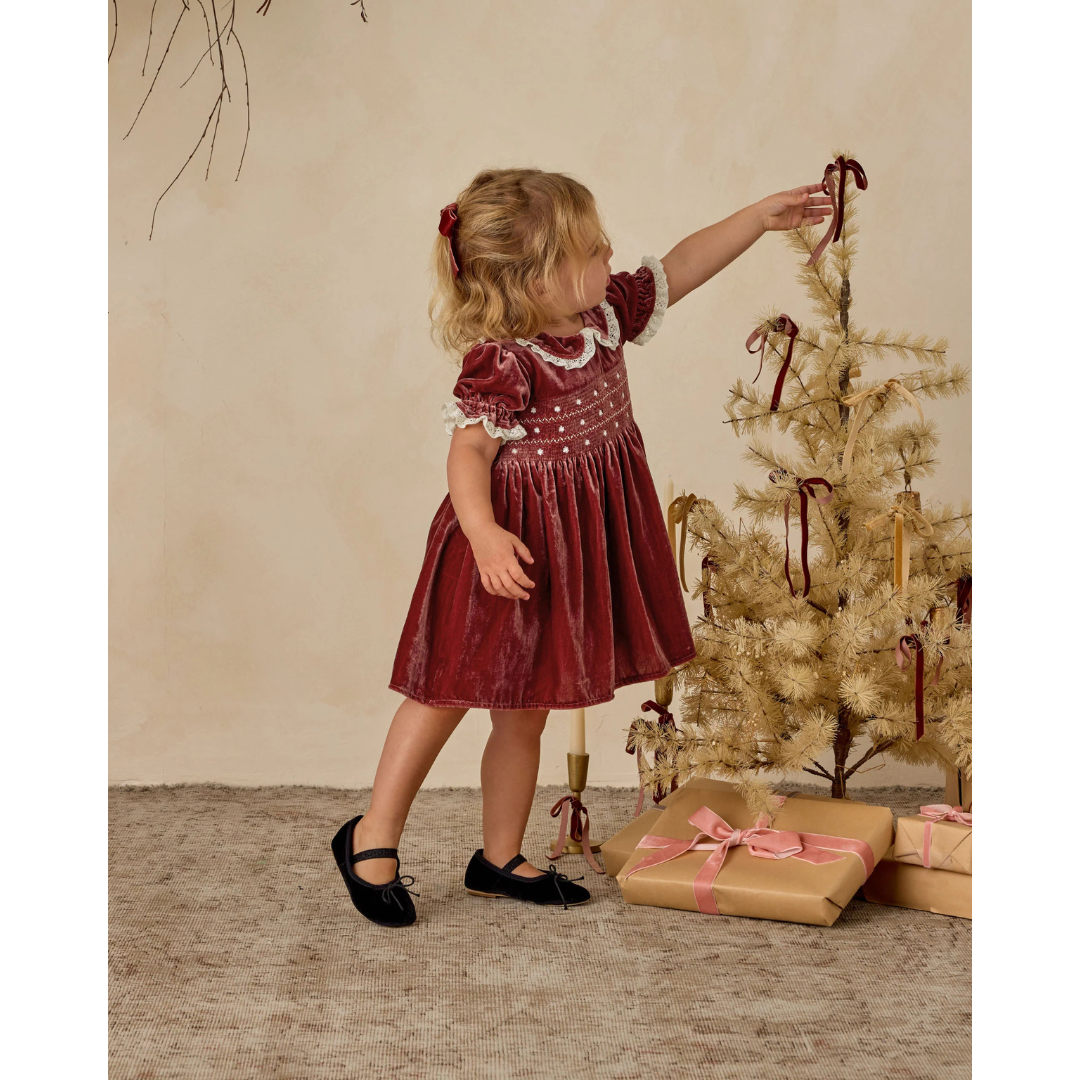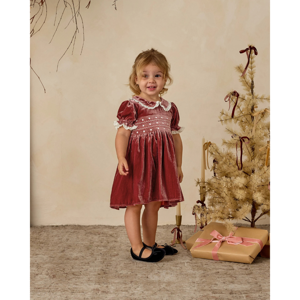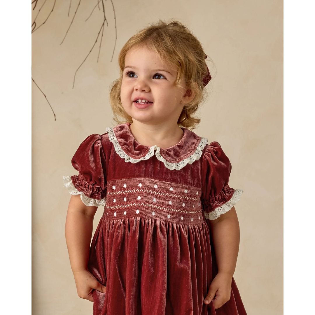 The Elizabeth Dress features a smocked bodice with dainty embroidered details, puff sleeves with lace trim, and a scalloped lace Peter Pan collar. Crafted in soft velvet, this timeless silhouette evokes a sense of tradition and nostalgia, making it the perfect keepsake dress for special occasions and holiday gatherings.