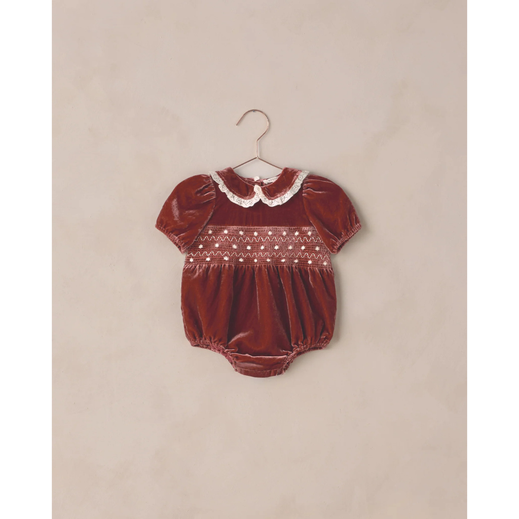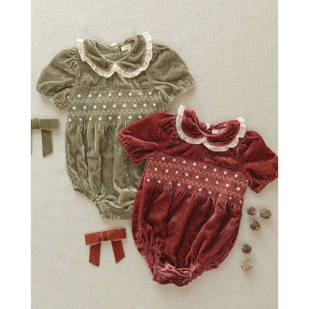 The Elizabeth Romper features a smocked bodice with dainty embroidered details, puff sleeves with lace trim, and a scalloped lace Peter Pan collar. Crafted in soft velvet, this timeless silhouette evokes a sense of tradition and nostalgia, making it the perfect keepsake dress for special occasions and holiday gatherings.