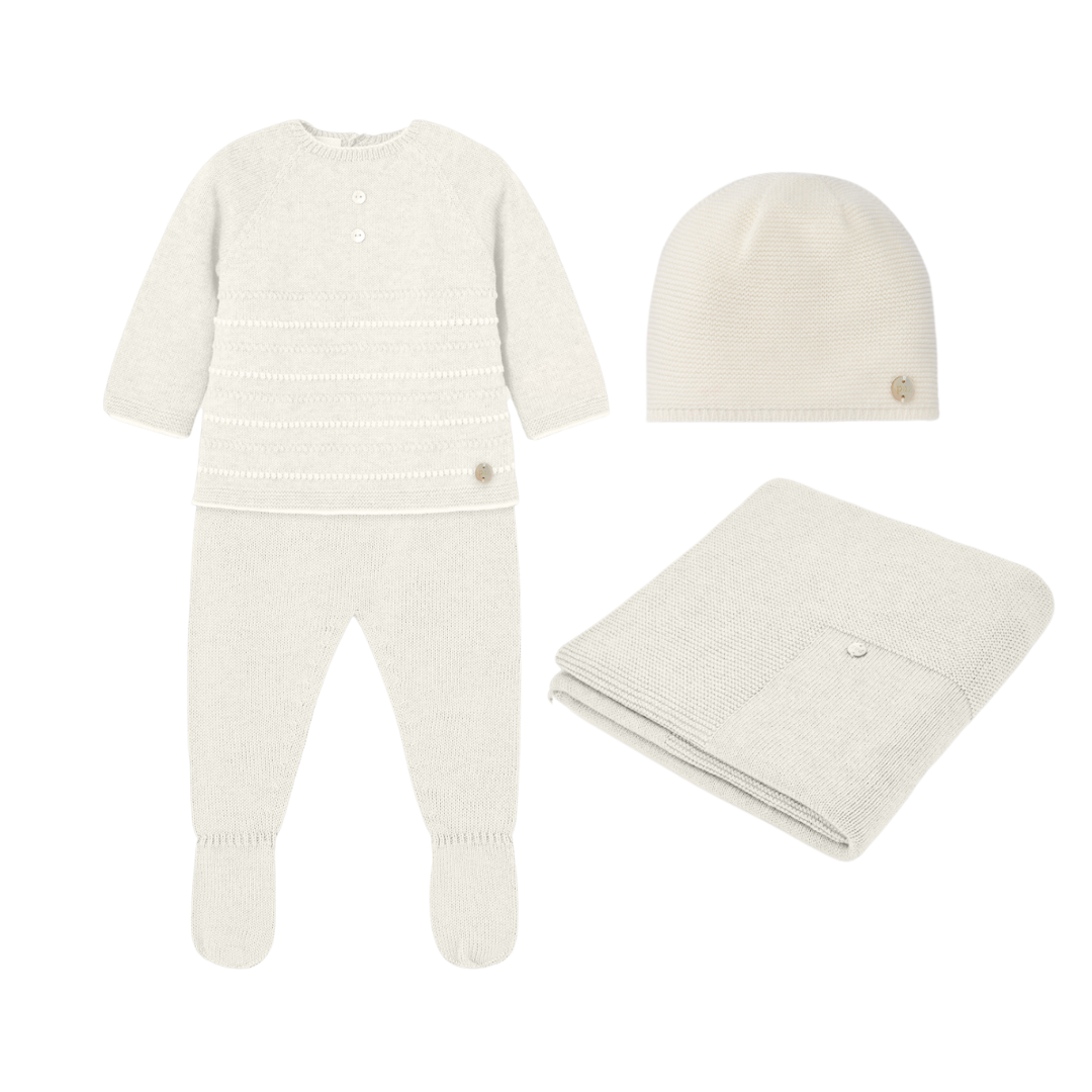 Four-piece set for newborns comprised of a knit top, footed pants, a coordinating hat and blanket.