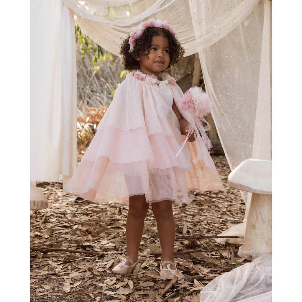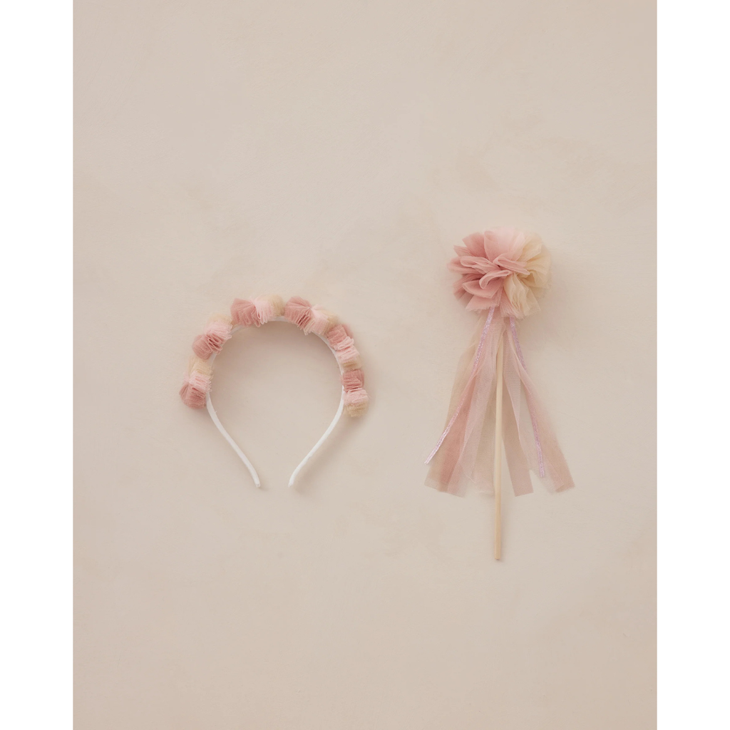 Pom Pom Crown headband and matching wand, adorned with tulle and metallic ribbons, add a whimsical touch to dress-up and play.