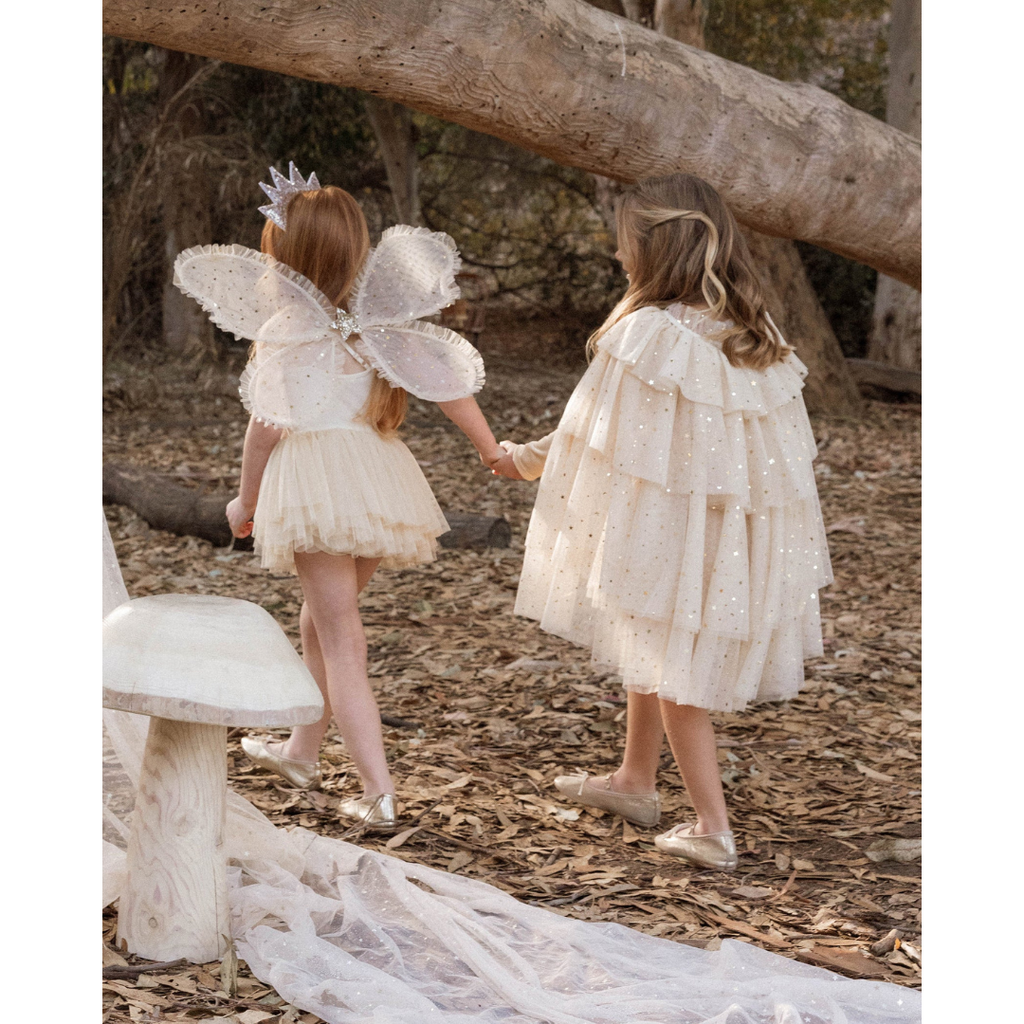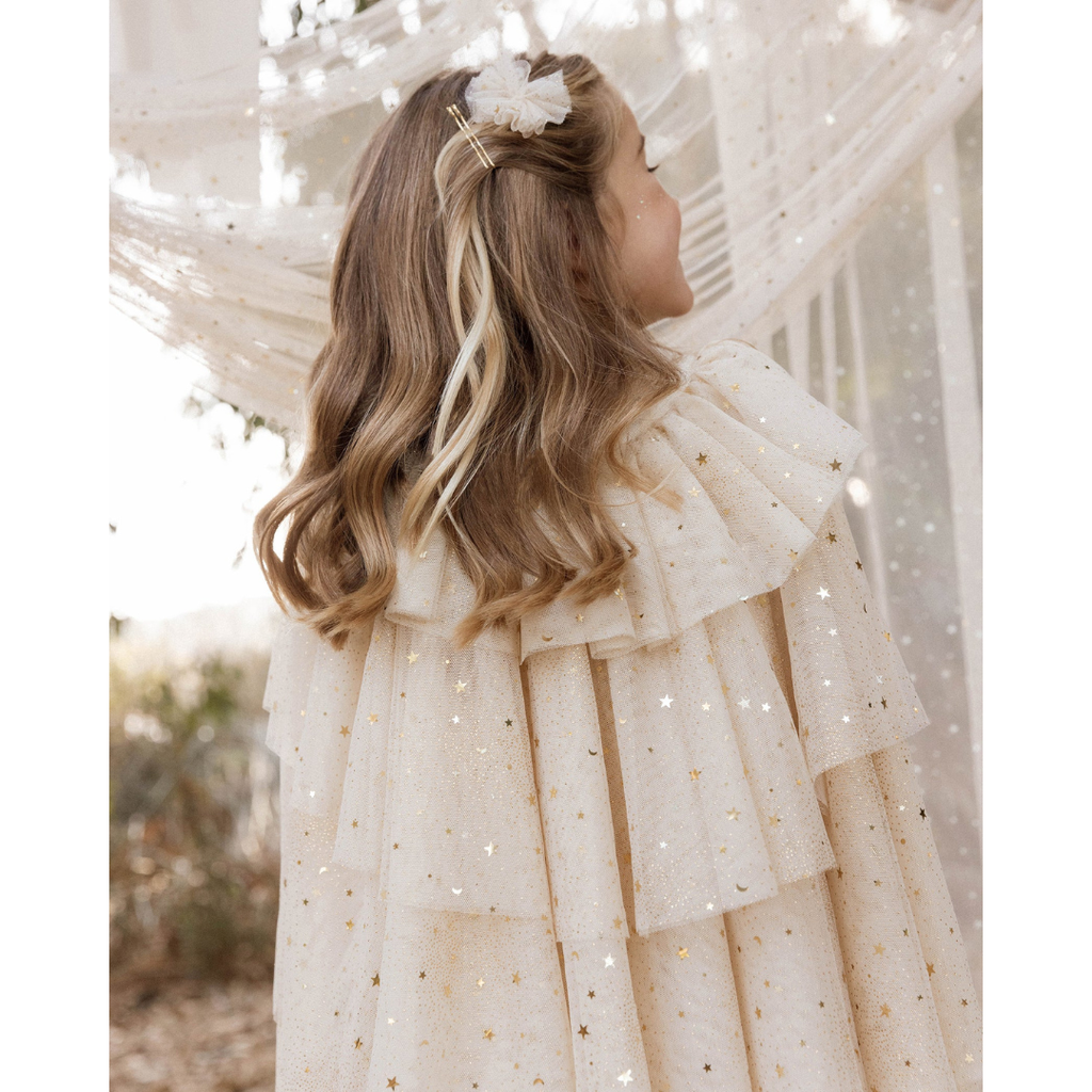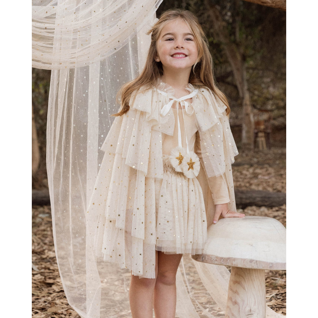 This Tulle Cape is perfect for little party princesses and enchanting adventures. It features flowing tiered tulle layers and self-ties at the center front for an adjustable, magical fit. Featuring a ‘champagne stars’ tulle.