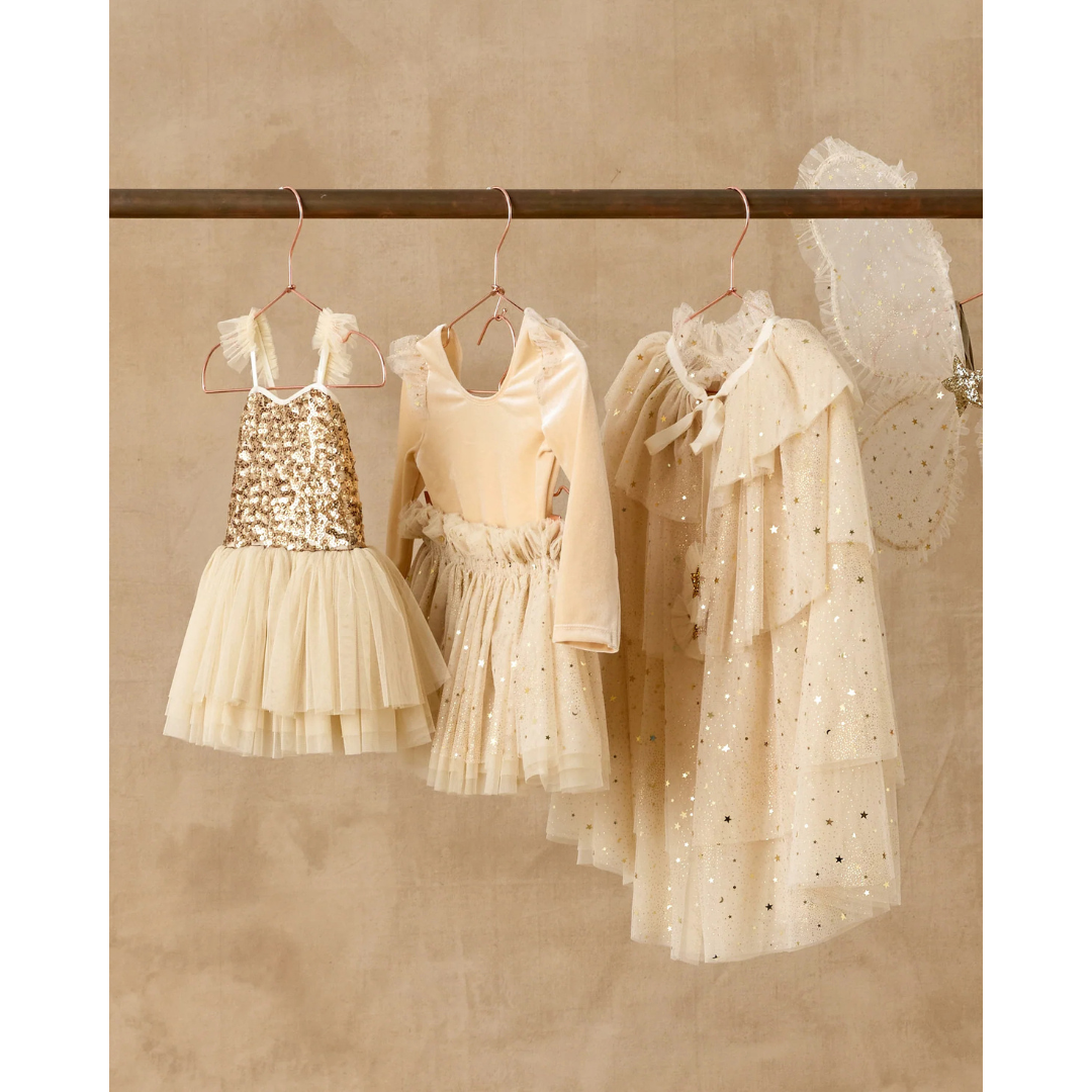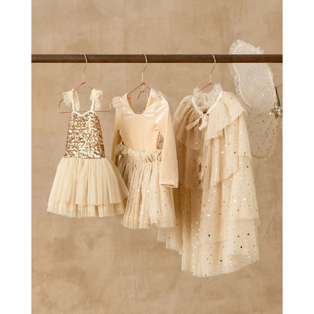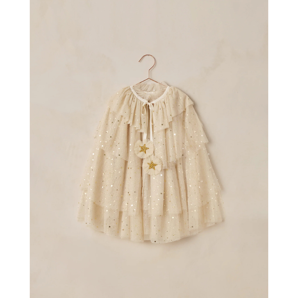 This Tulle Cape is perfect for little party princesses and enchanting adventures. It features flowing tiered tulle layers and self-ties at the center front for an adjustable, magical fit. Featuring a ‘champagne stars’ tulle.