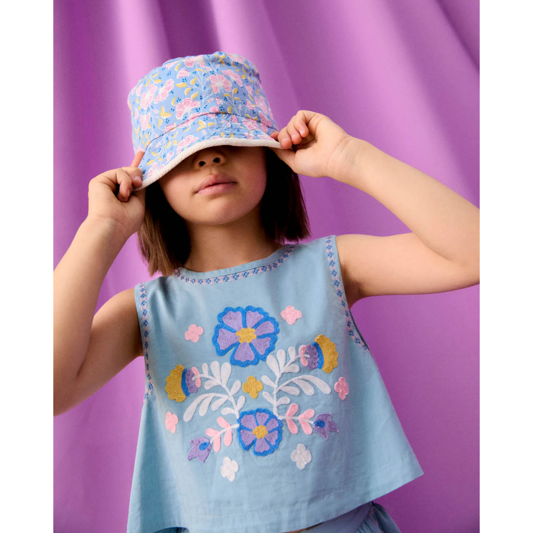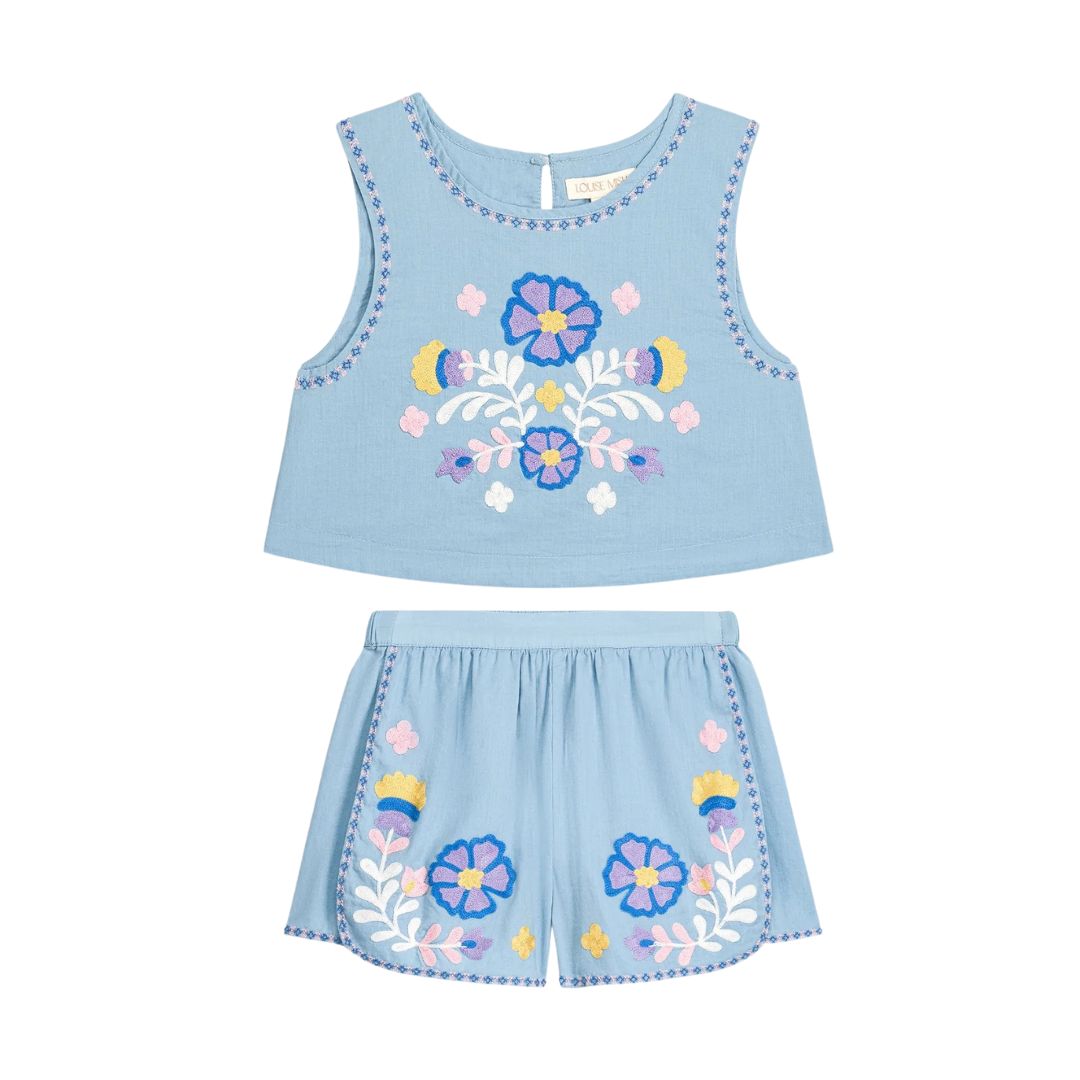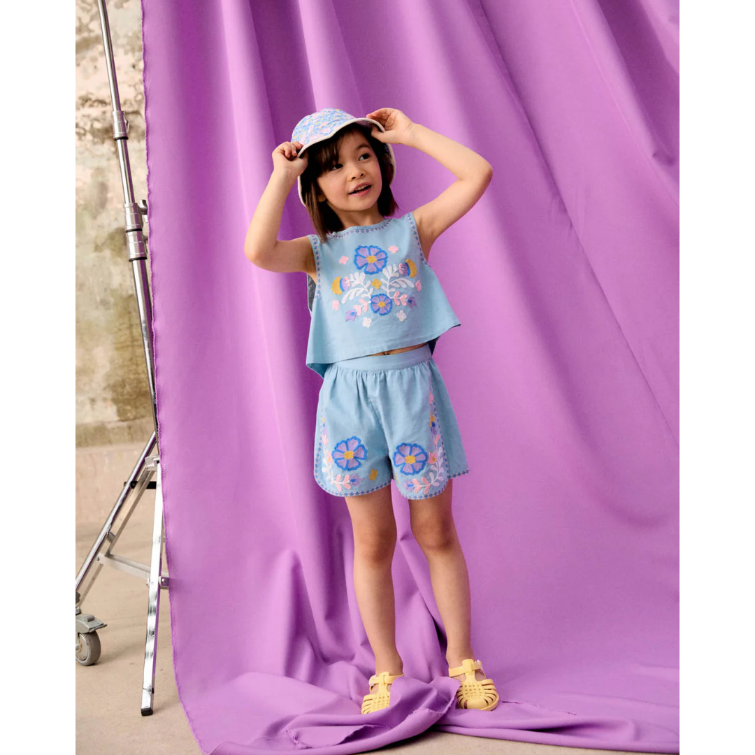 Cotton veil short set comprised of a sleeveless top and shorts. The top features textured embroidereies at the front, embroidered cross-stitch details at the neckline and armholes, slit opening at the back with a button and cross-over panels at the back. The shorts feature an elastic waist and large textured embroideries.