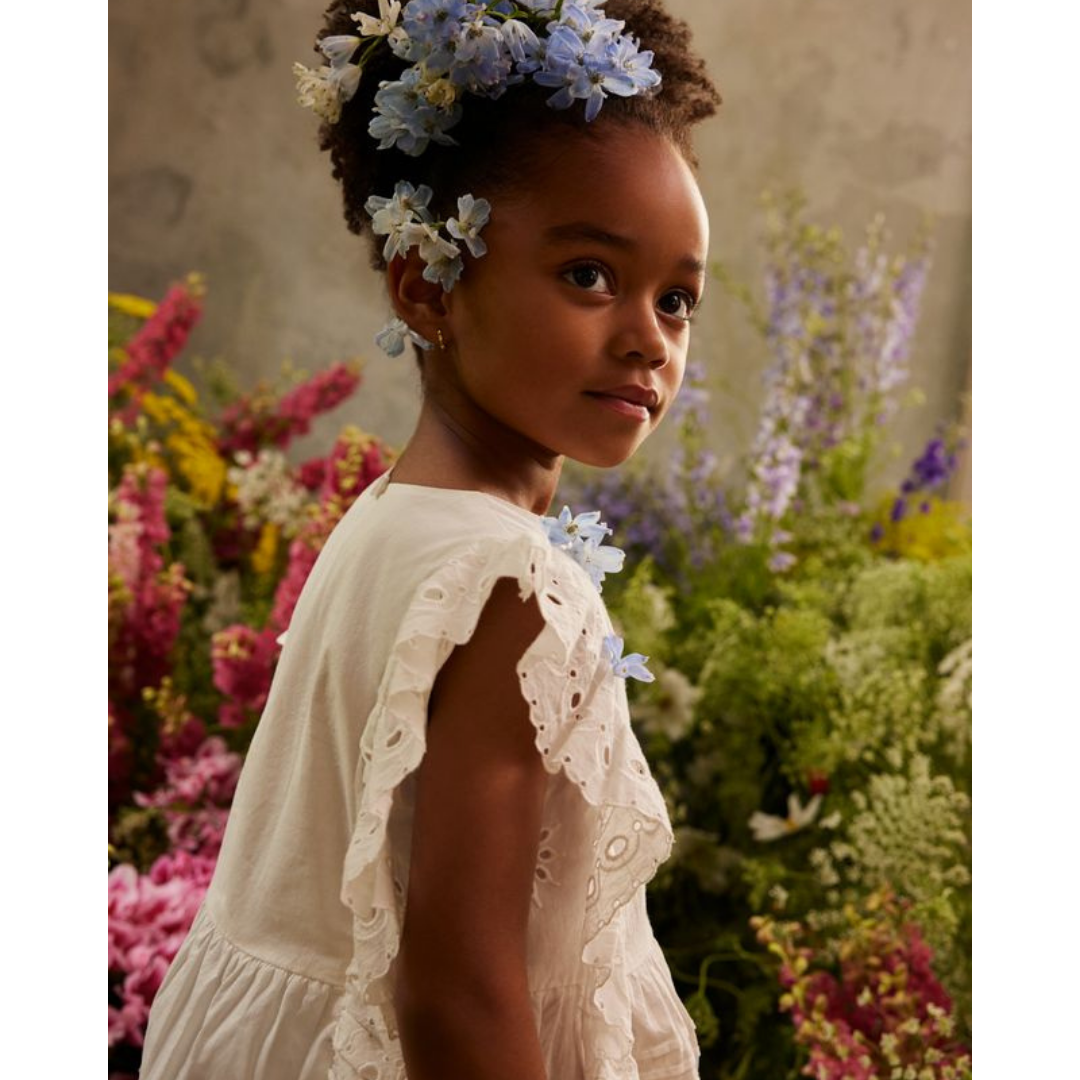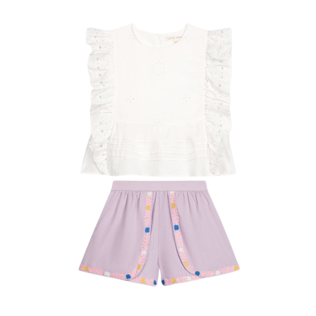 Two piece set comprised of a white blouse with ruffled and eyelet details and pull-on shorts with an elasticated wiast and emrboirdered details.