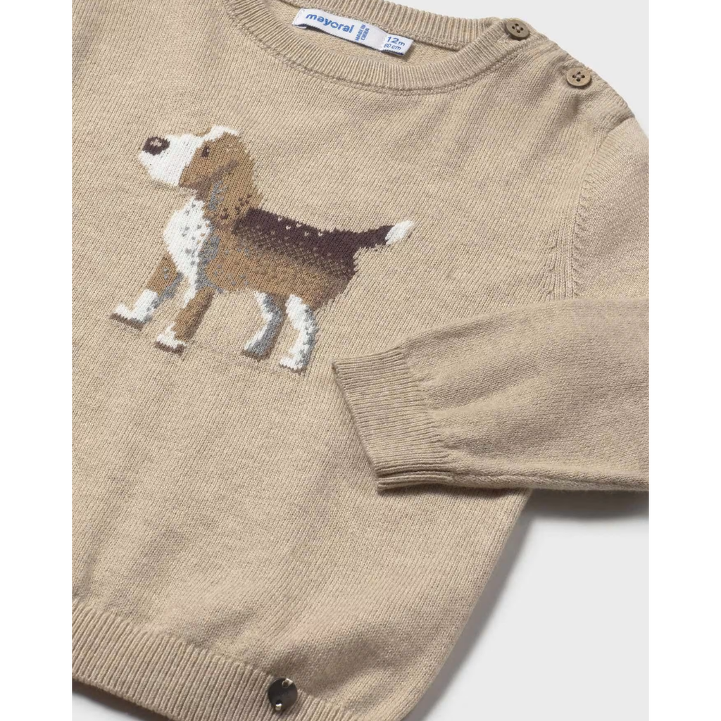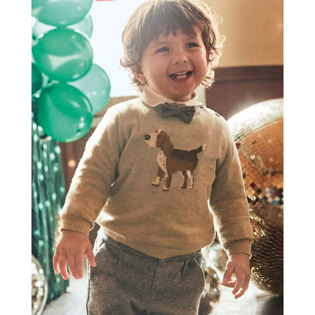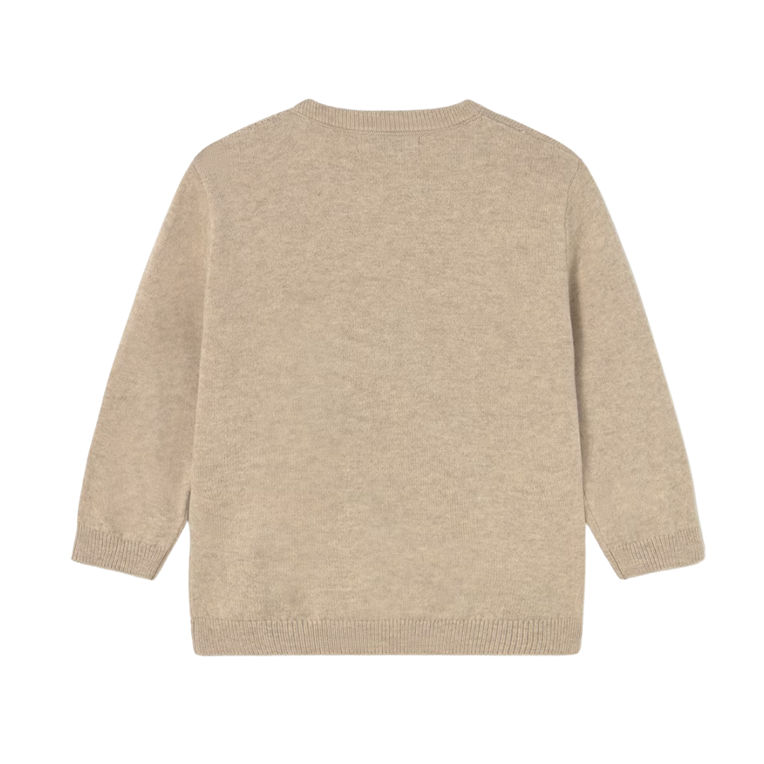 Sweater with a crew neck, button closure at neck for easy adjustment and a graphic on the front.