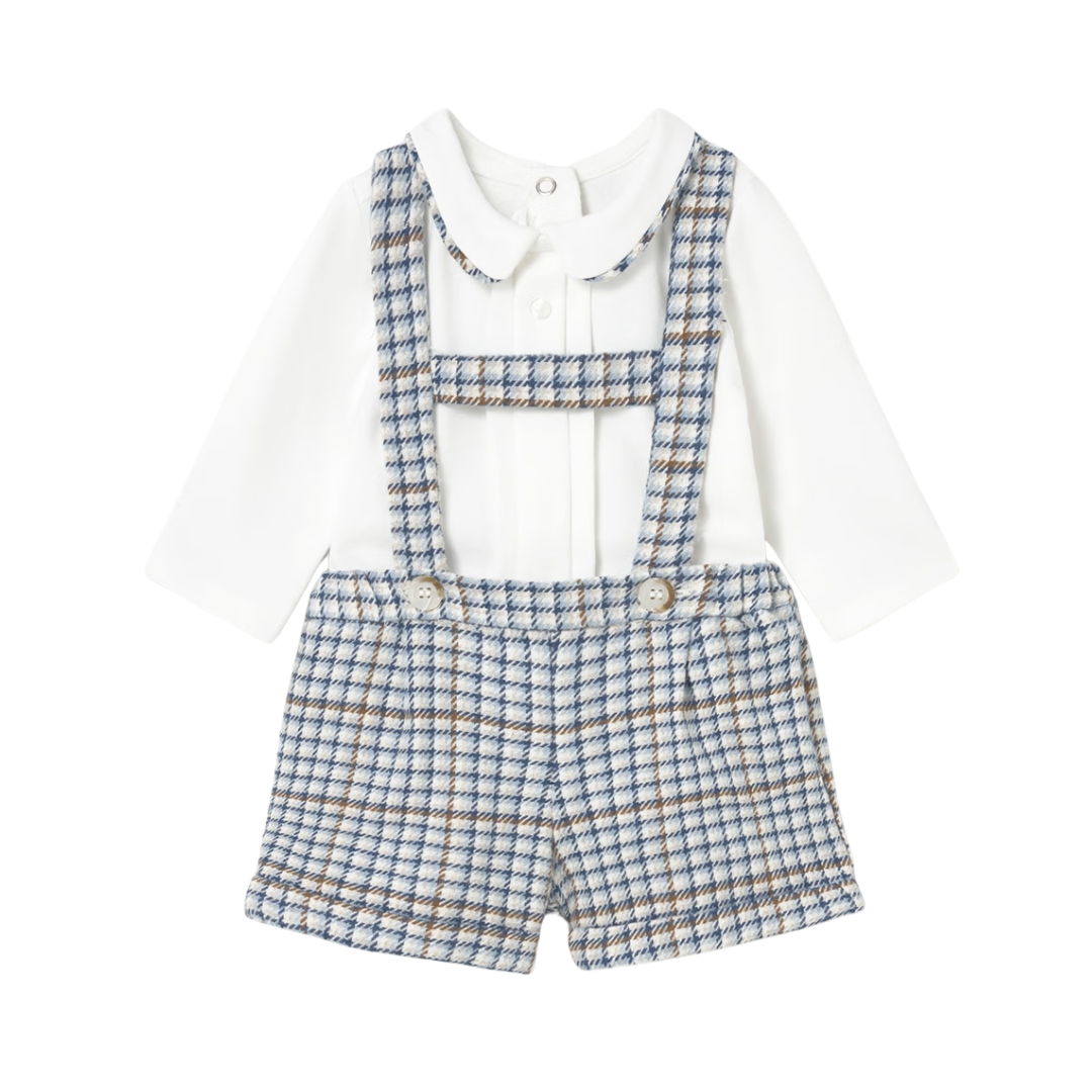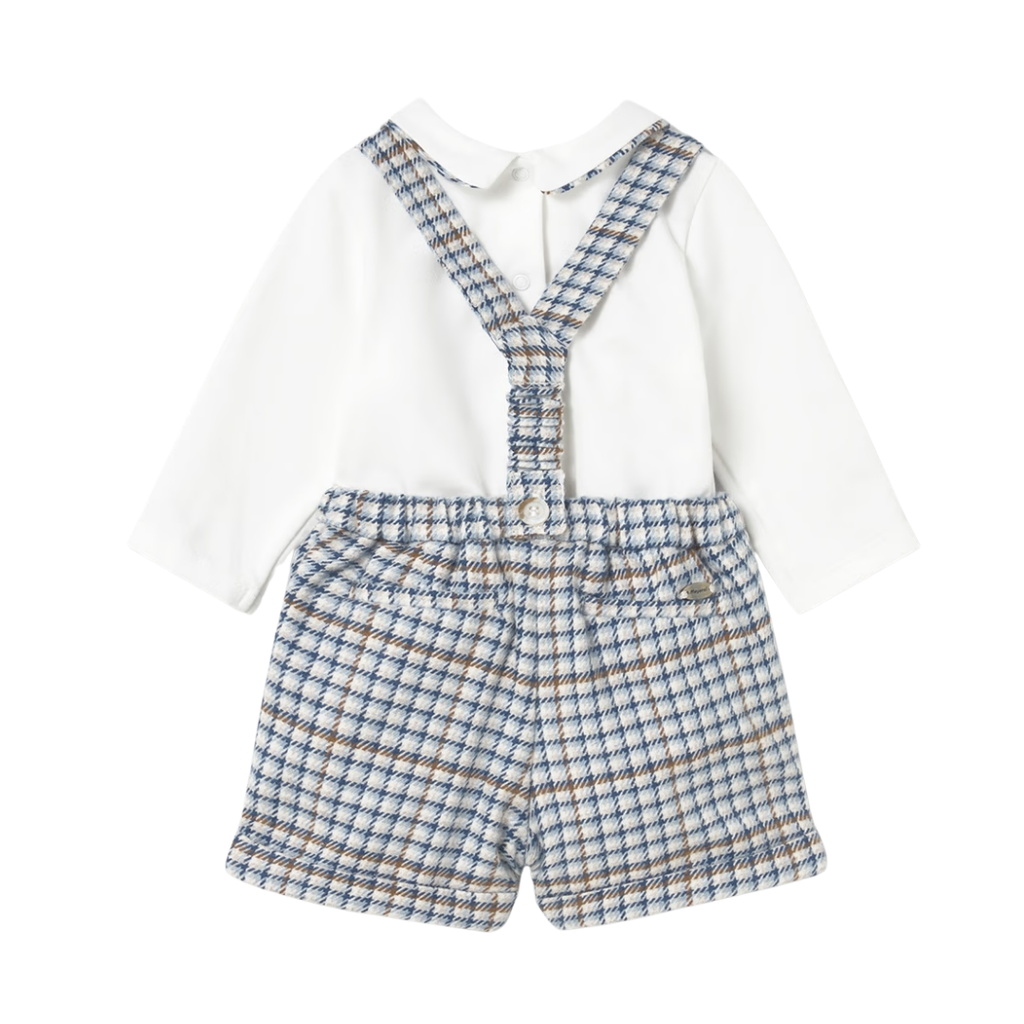 Two-piece set comprised of a long-sleeved onesie and overalls. The onesie features a collar with a houndstooth trim and snap buttons on the back and legs. The overalls feature an elastic waistband, turn-up hem detail and an all-over houndstooth pattern.