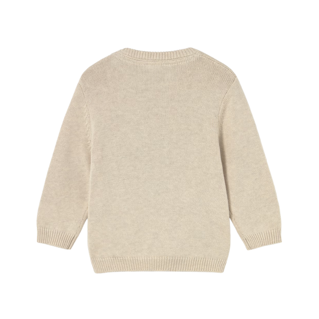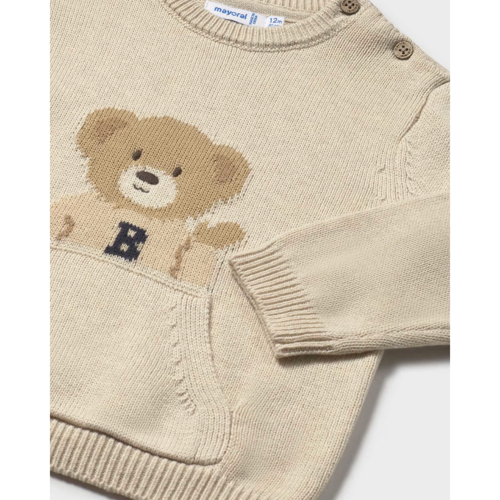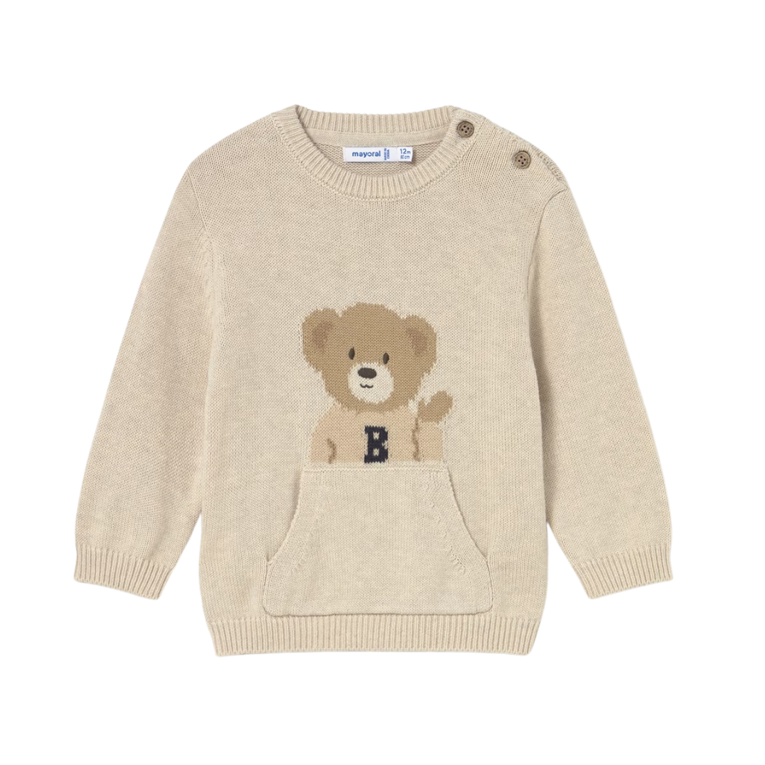 Cream sweater with a crew neck, buttons at the shoulder for easy dressing, a functional pocket at the front and a bear graphic design on the front.