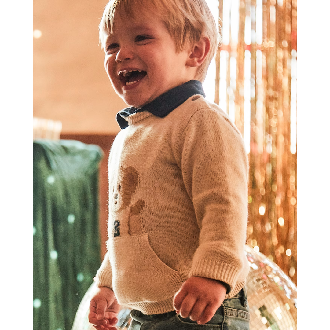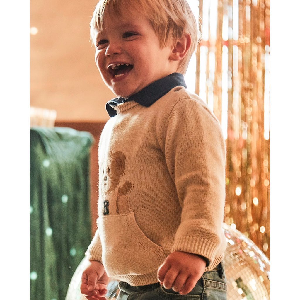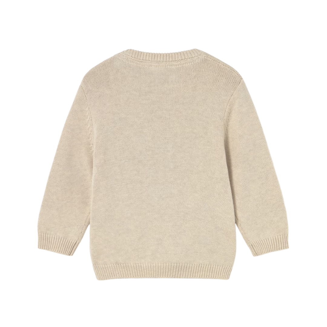 Cream sweater with a crew neck, buttons at the shoulder for easy dressing, a functional pocket at the front and a bear graphic design on the front.