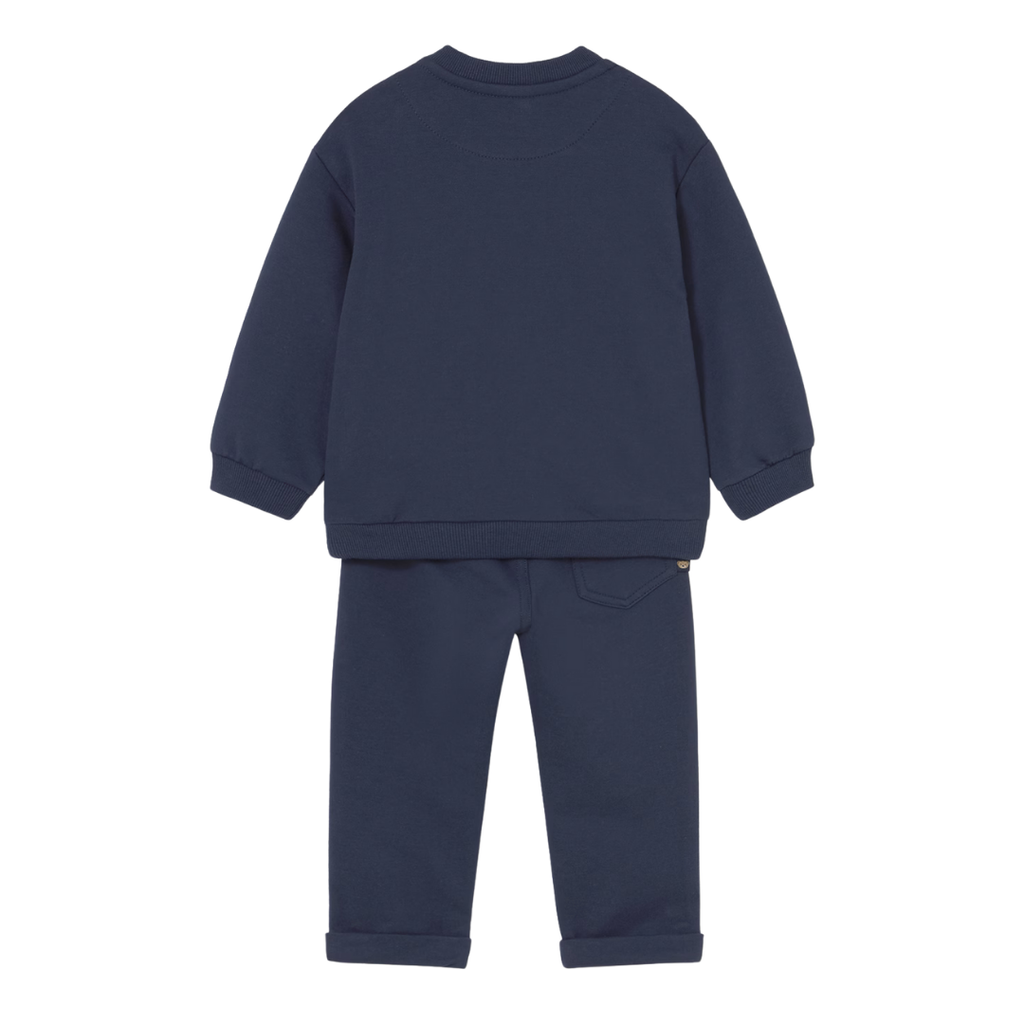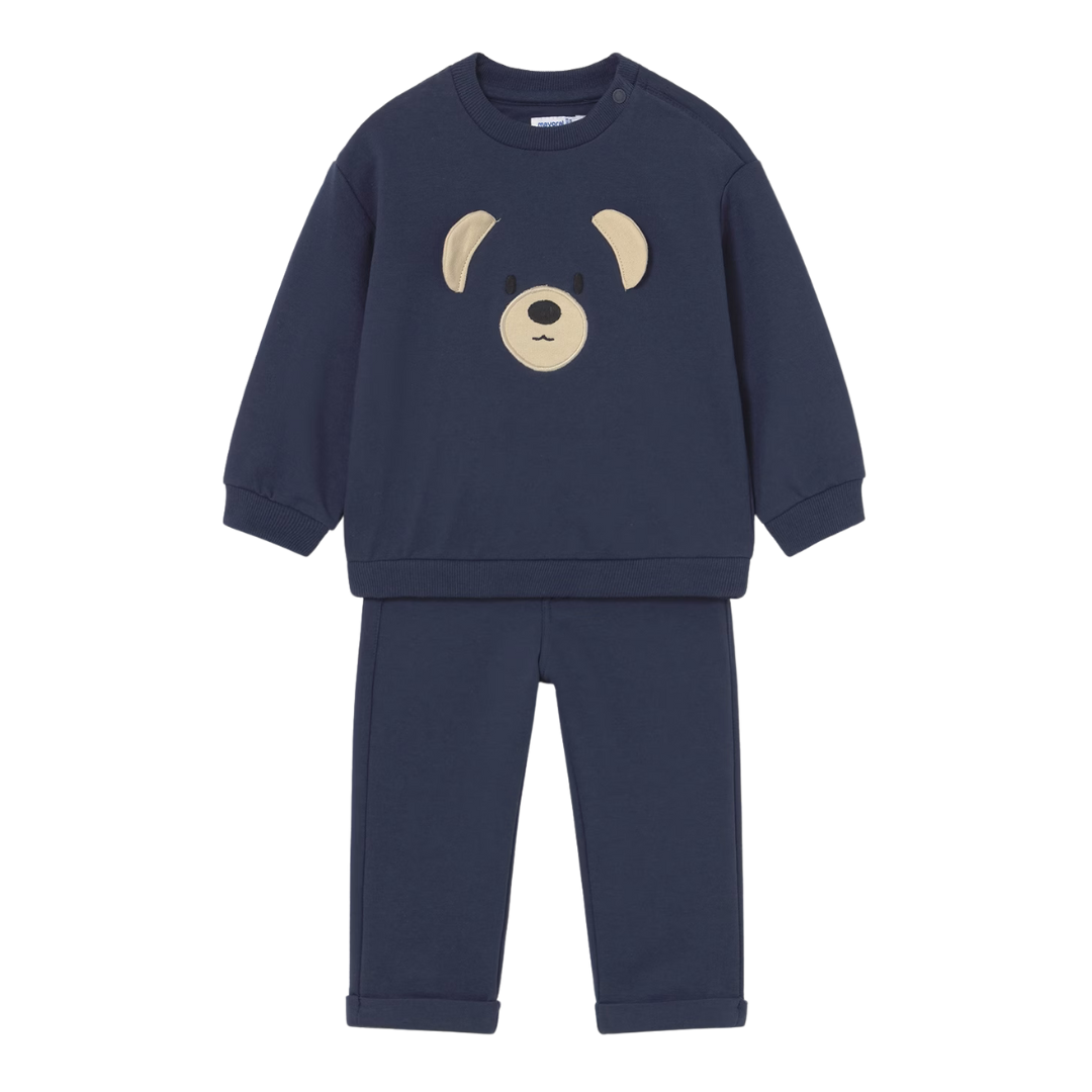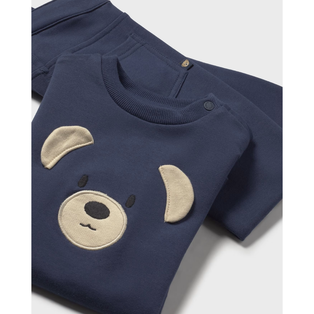 Two-piece tracksuit with a sweatshirt and long pants.The sweatshirt features a round neckline, snap button at the neckline for easy dressing and decorative elements that ear appliqués and embroidery to create the face of a bear on the front. The pants feature a straight-cut with an adjustable elastic waistband and snap buttons for a snug fit.