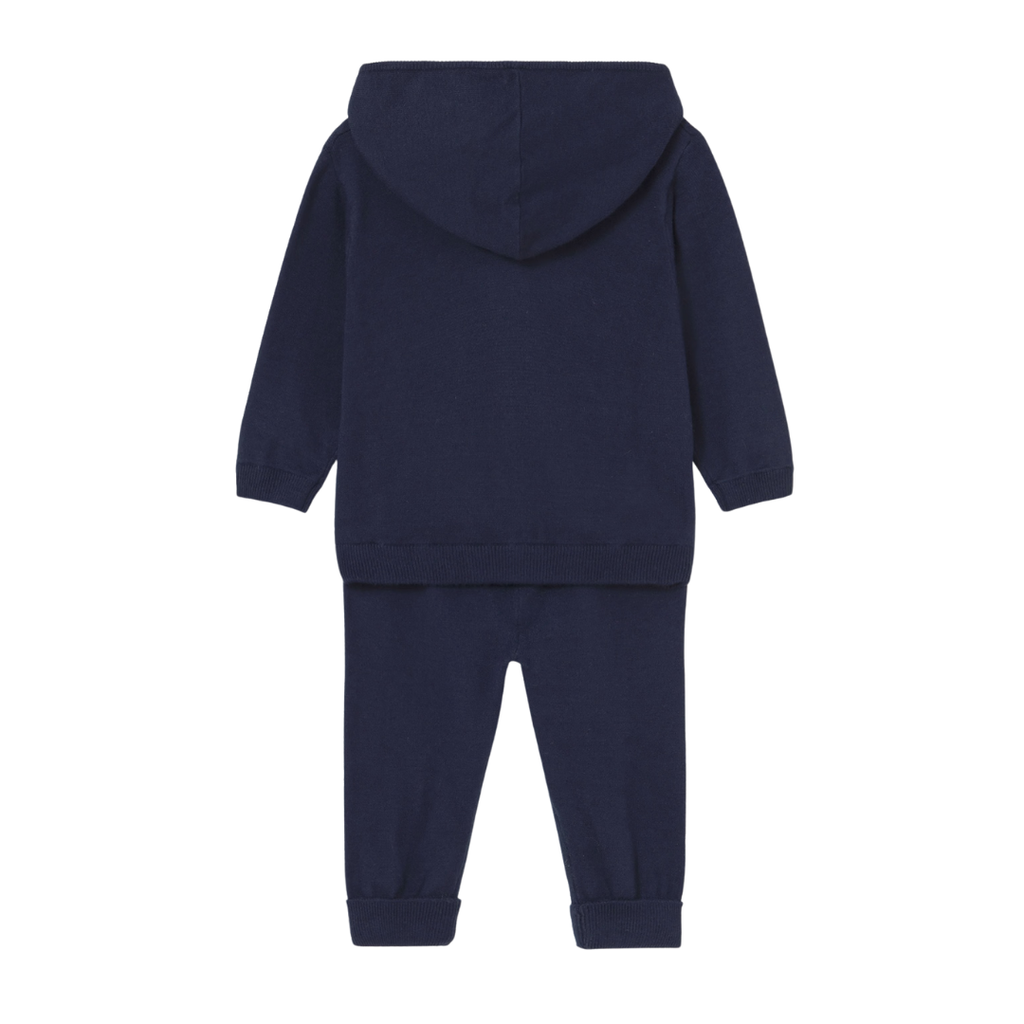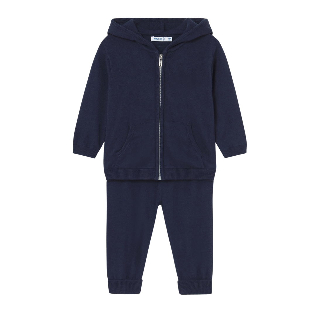 Two-piece tracksuit with a sweatshirt and long pants.The jacket features a hooded collar, center front closure and a functional front pocket. The pants feature an elastic waistband with drawstring.