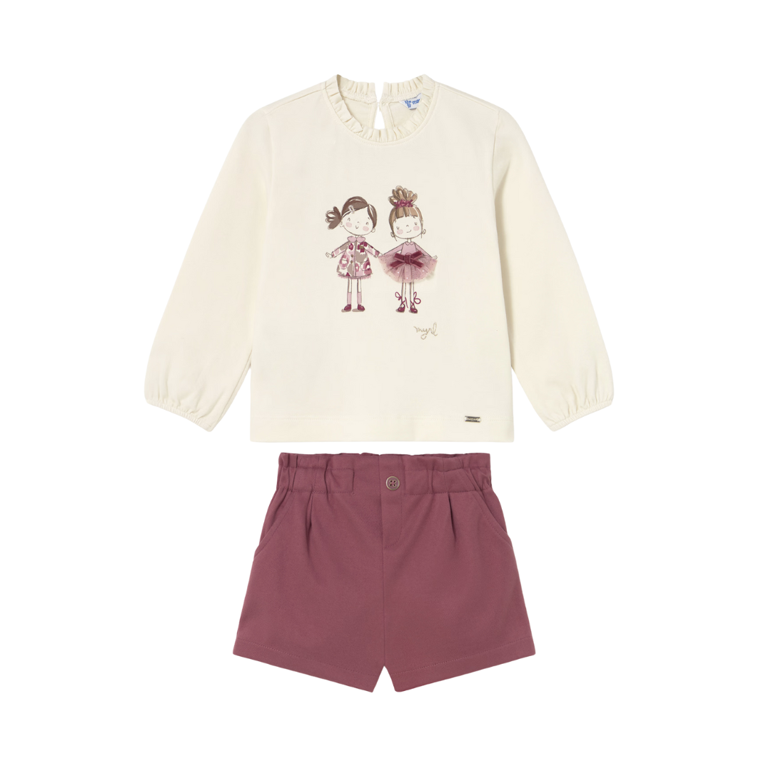 Two-piece set comprised of a long-sleeved t-shirt and shorts. The top features a round neck with a ruffle, single button closure and decorative elements on the front. The shorts feature an elastic waistband with adjustable elastic with buttons on the inside of the waistband for a snug fit and decorative mock front pockets.