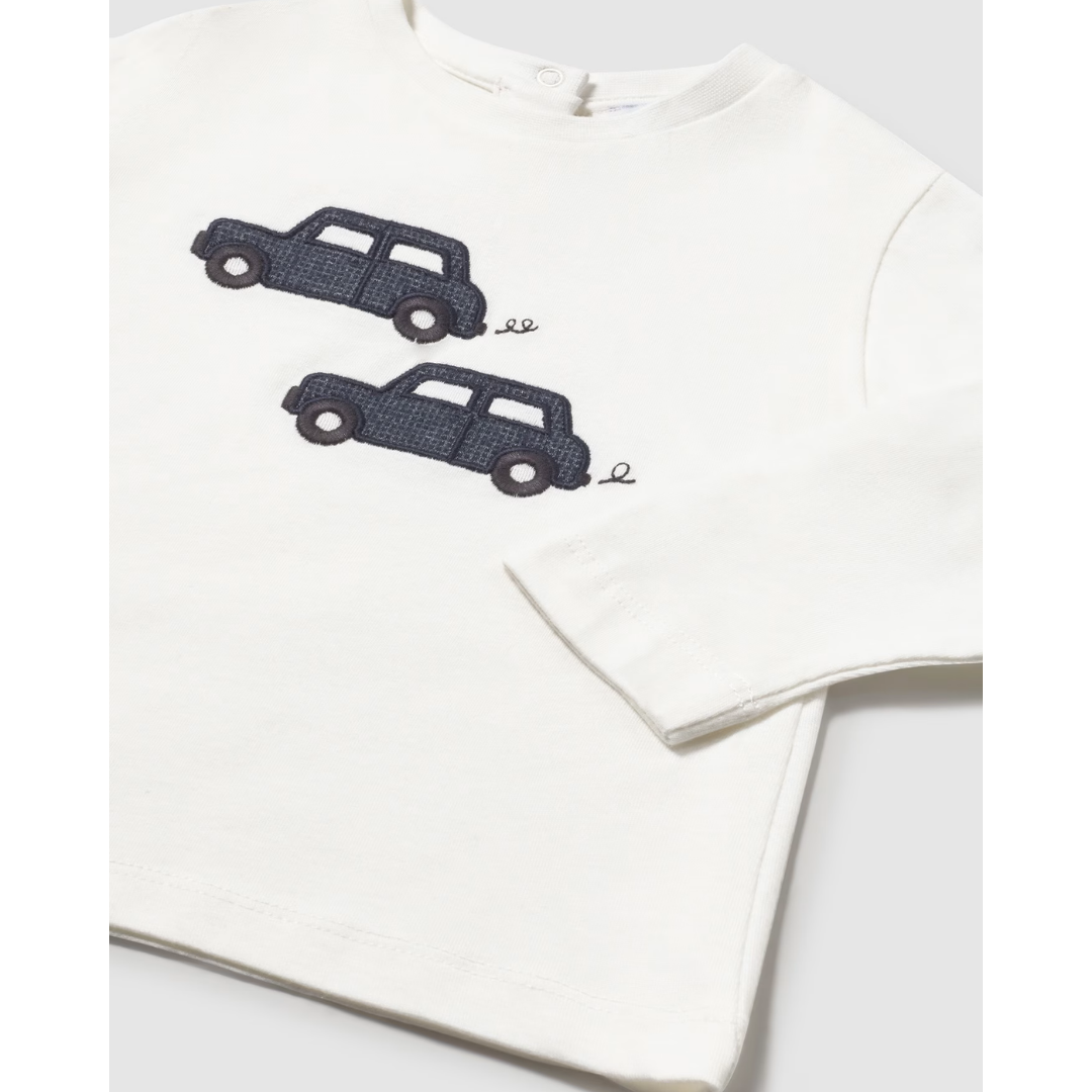 Long-sleeved T-shirt with a crew neck and car graphics on the front.