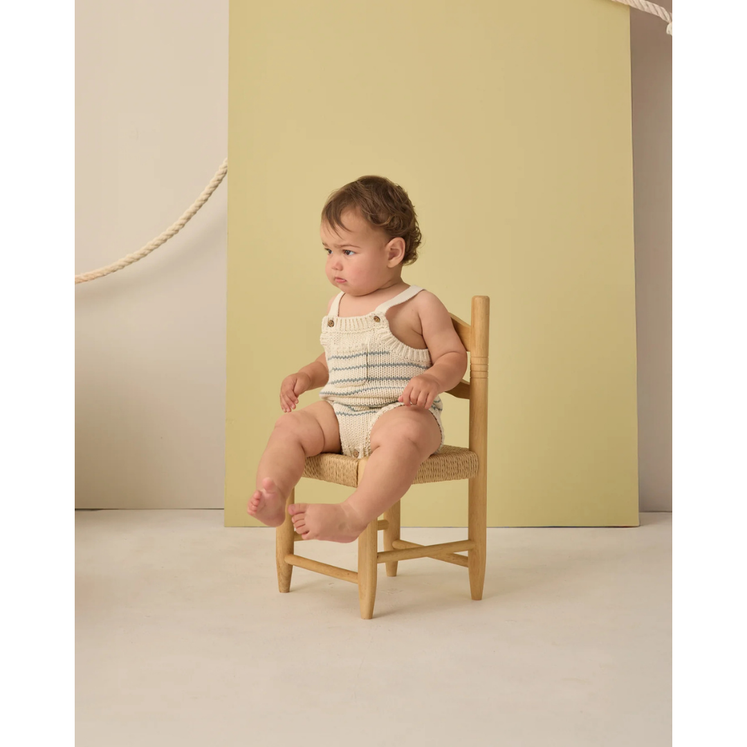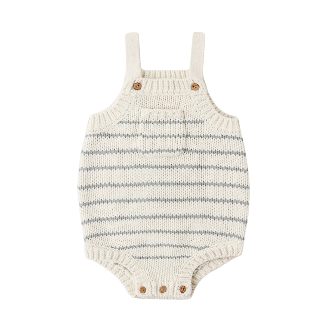 The Ashton Knit Romper features buttoned straps, front pocket detail, and coconut buttons at the bottom for easy changes. Featuring a 'sea green stripe' knit pattern. Have some fun in the sun in this cool stripe.