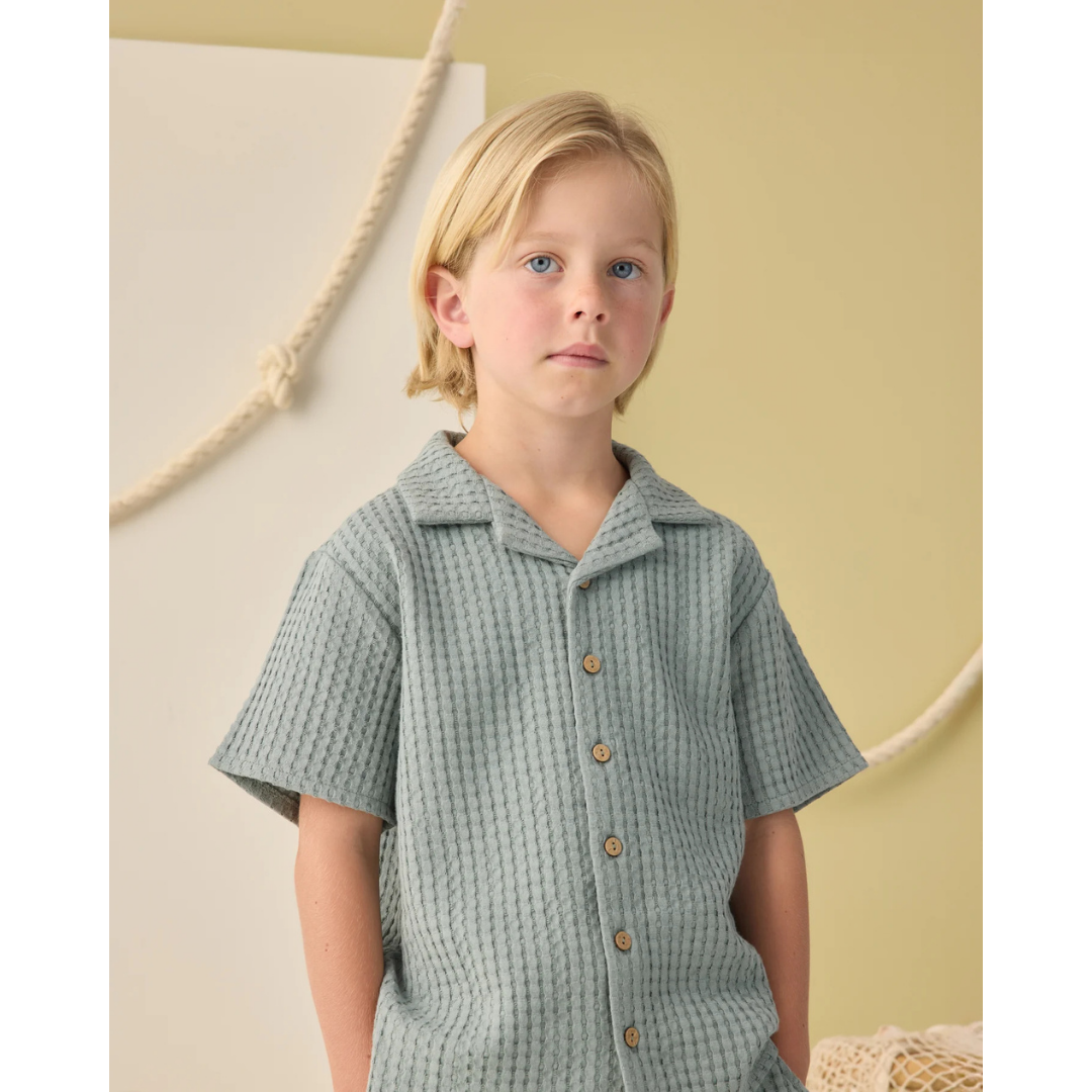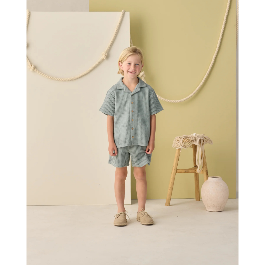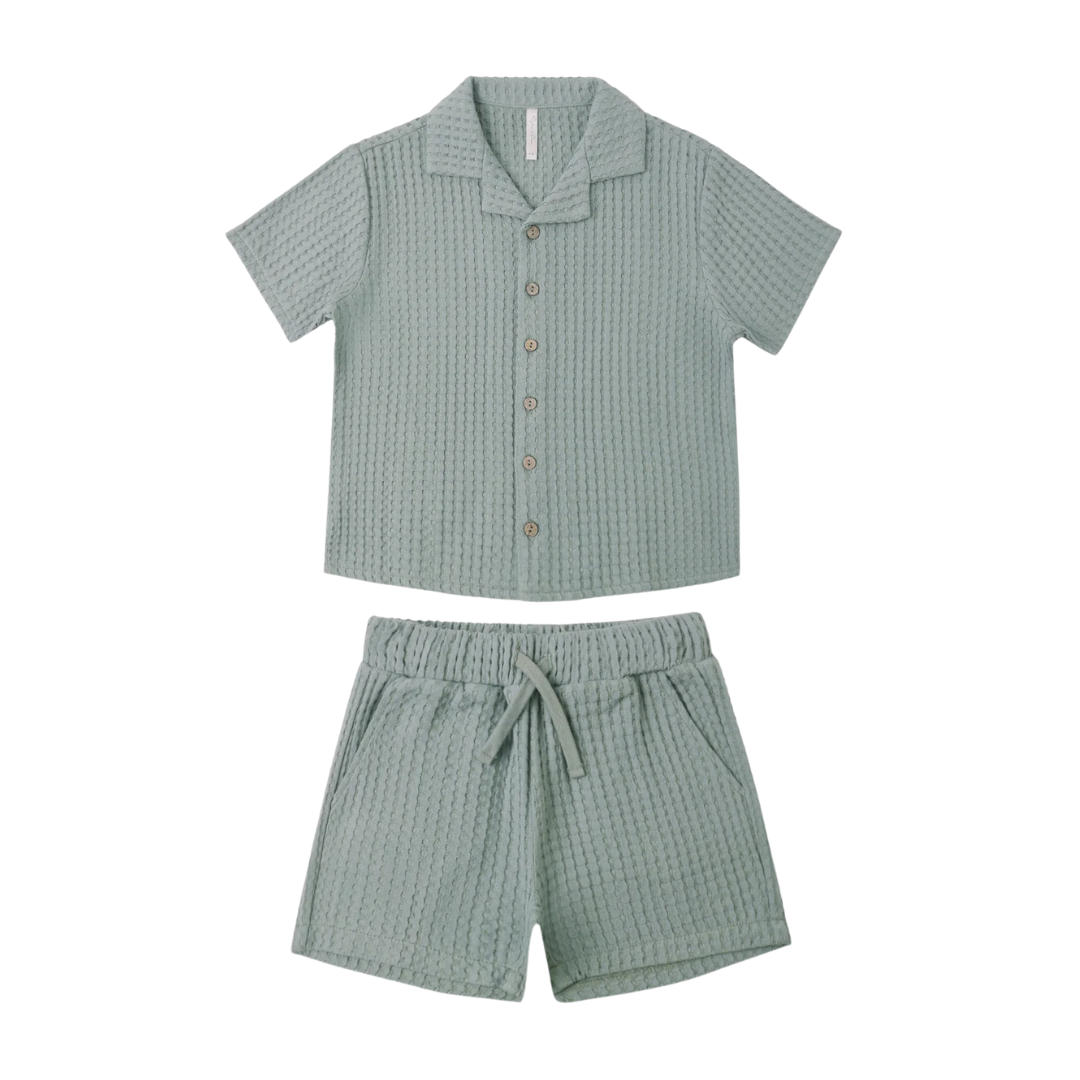 This button up shirt features a lapel collar and chest pocket and the shorts feature an elastic waistband with adjustable drawstring and pockets. Featuring a 'sea green' hue. Enjoy seaside days in this cool look.