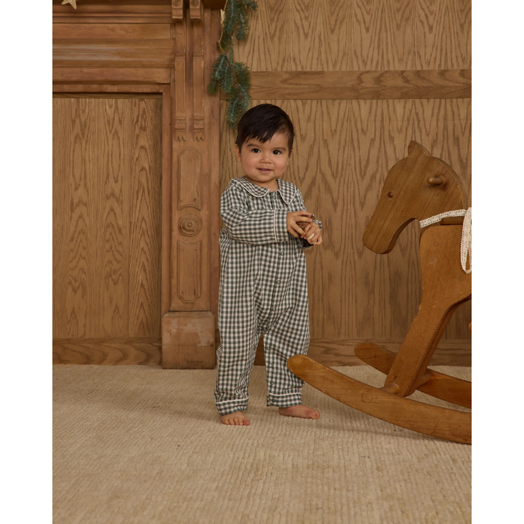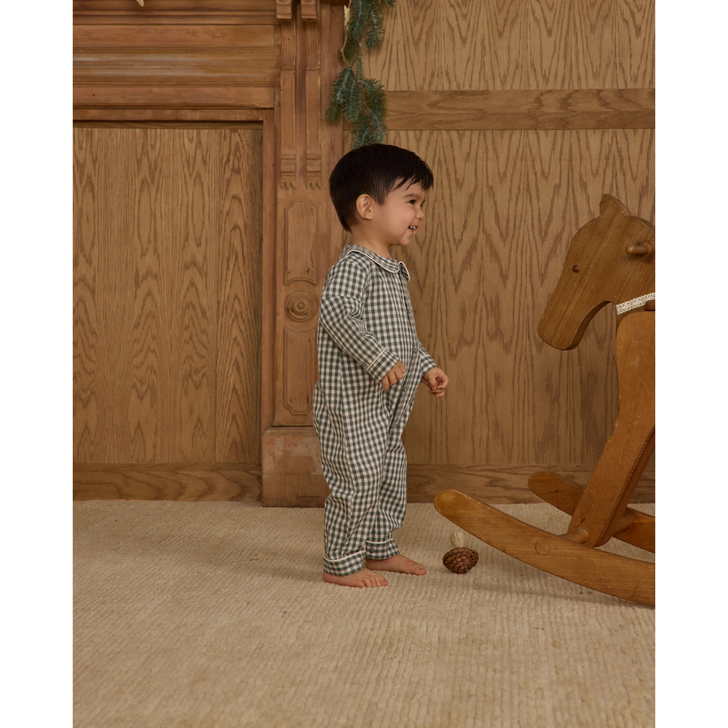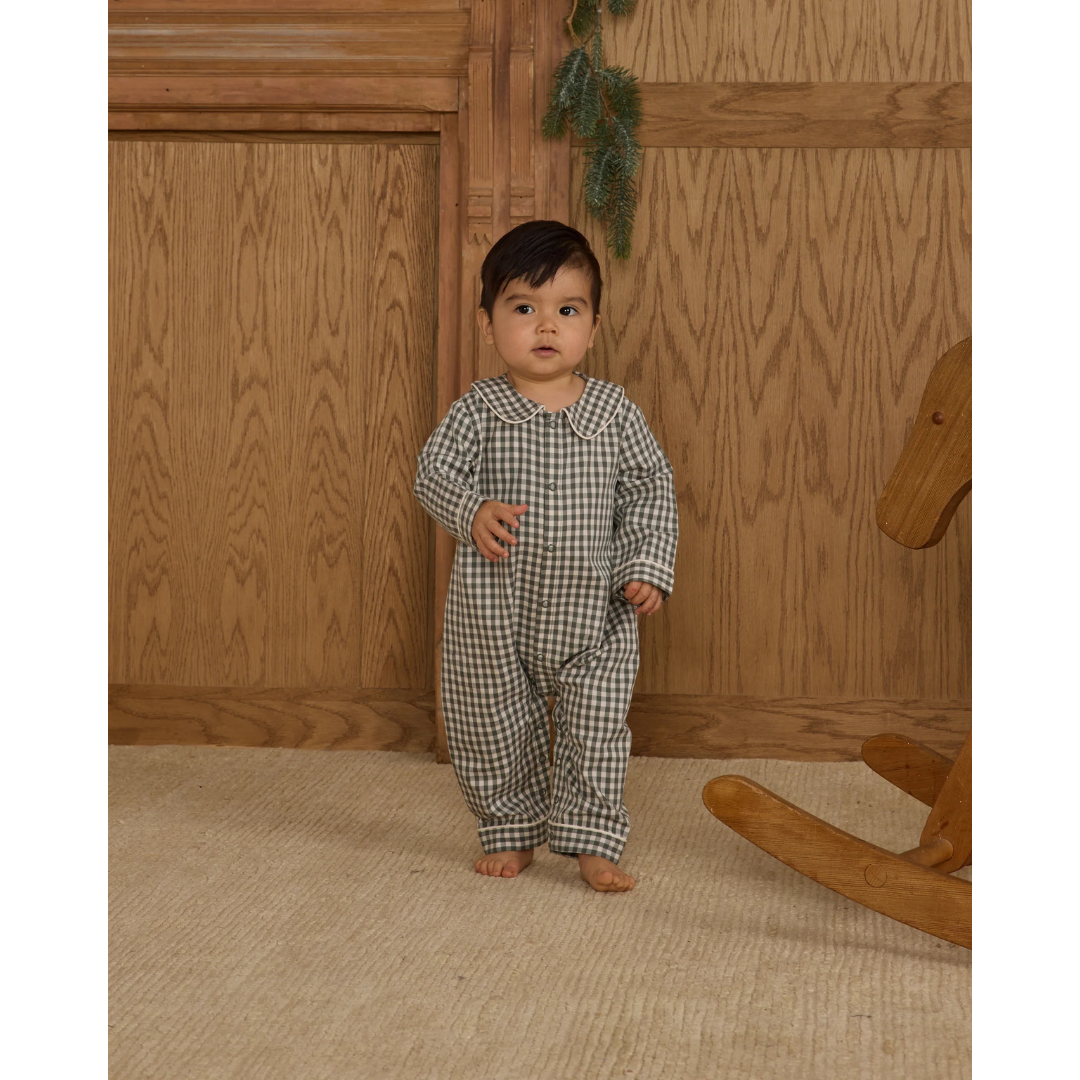 This longall has long sleeves and snap buttons along the center front and snaps at the inseam for easy changing. Featuring an 'evergreen gingham' all-over pattern.